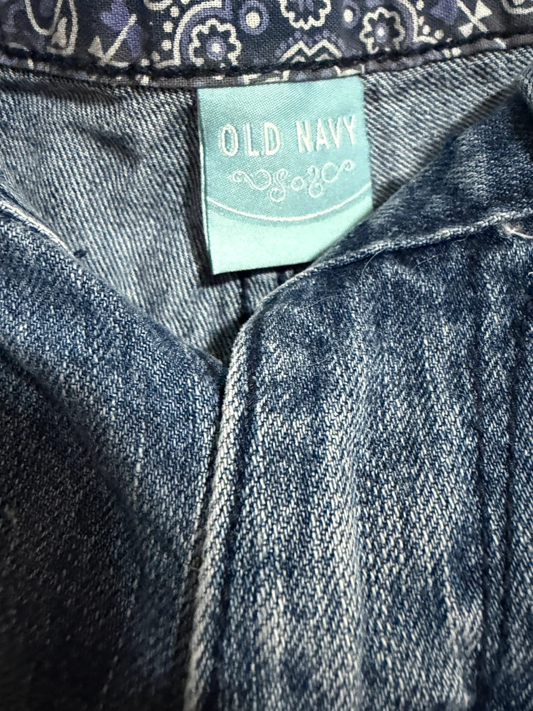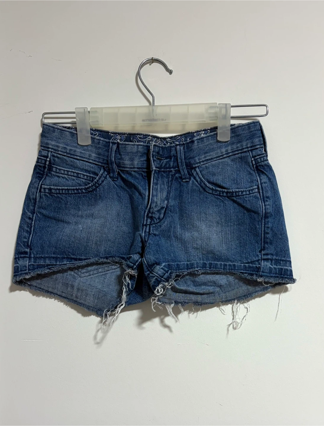 Blue denim shorts. They've got a distressed hemline and a classic five-pocket design. Material is 100% cotton. These shorts are perfect for warm weather adventures!
