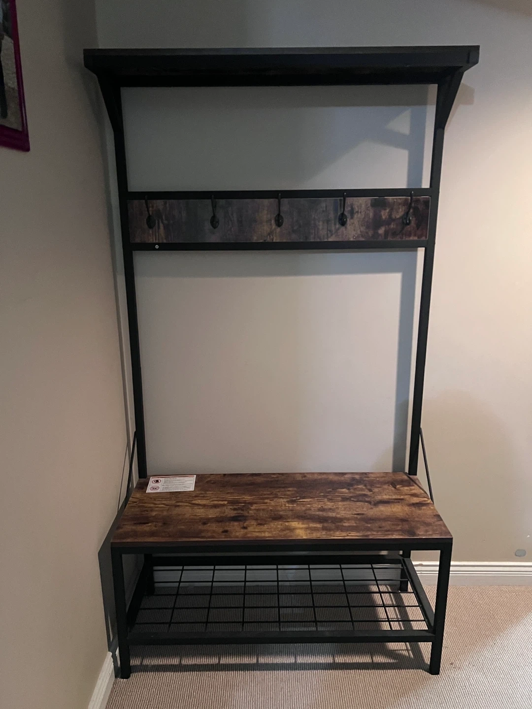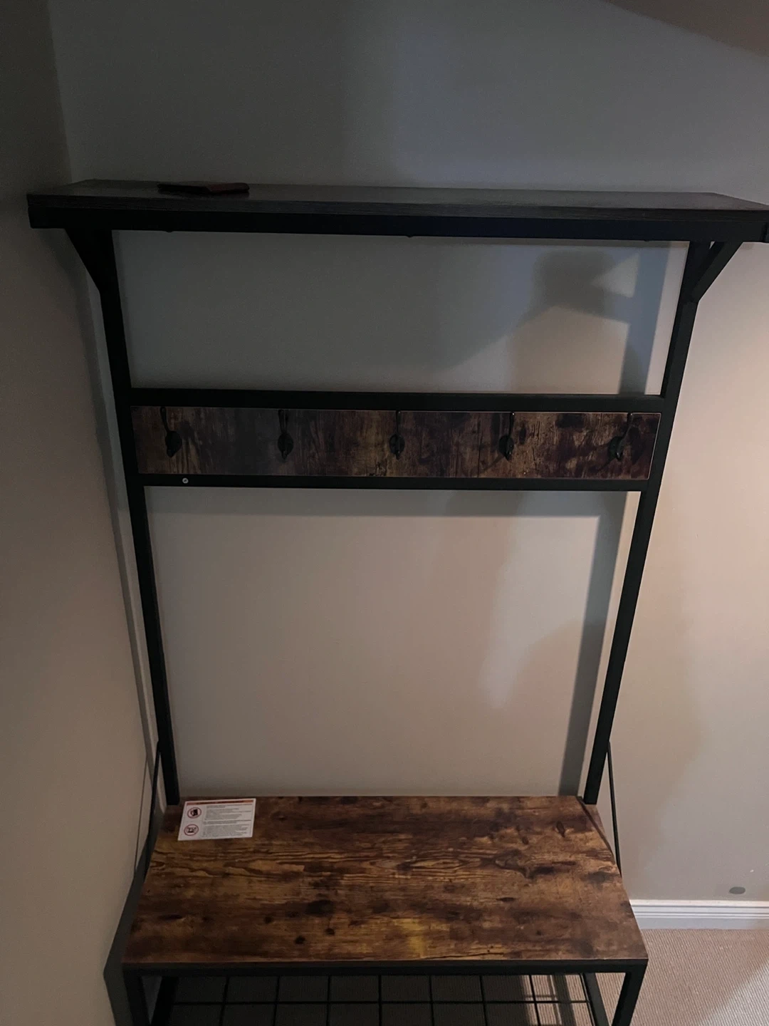 This entryway hall tree features a shelf for display and five hooks for coats and bags. It also includes a bench with a slatted shelf below, perfect for storing shoes. Its rustic wood and black metal design adds a touch of style to your home.