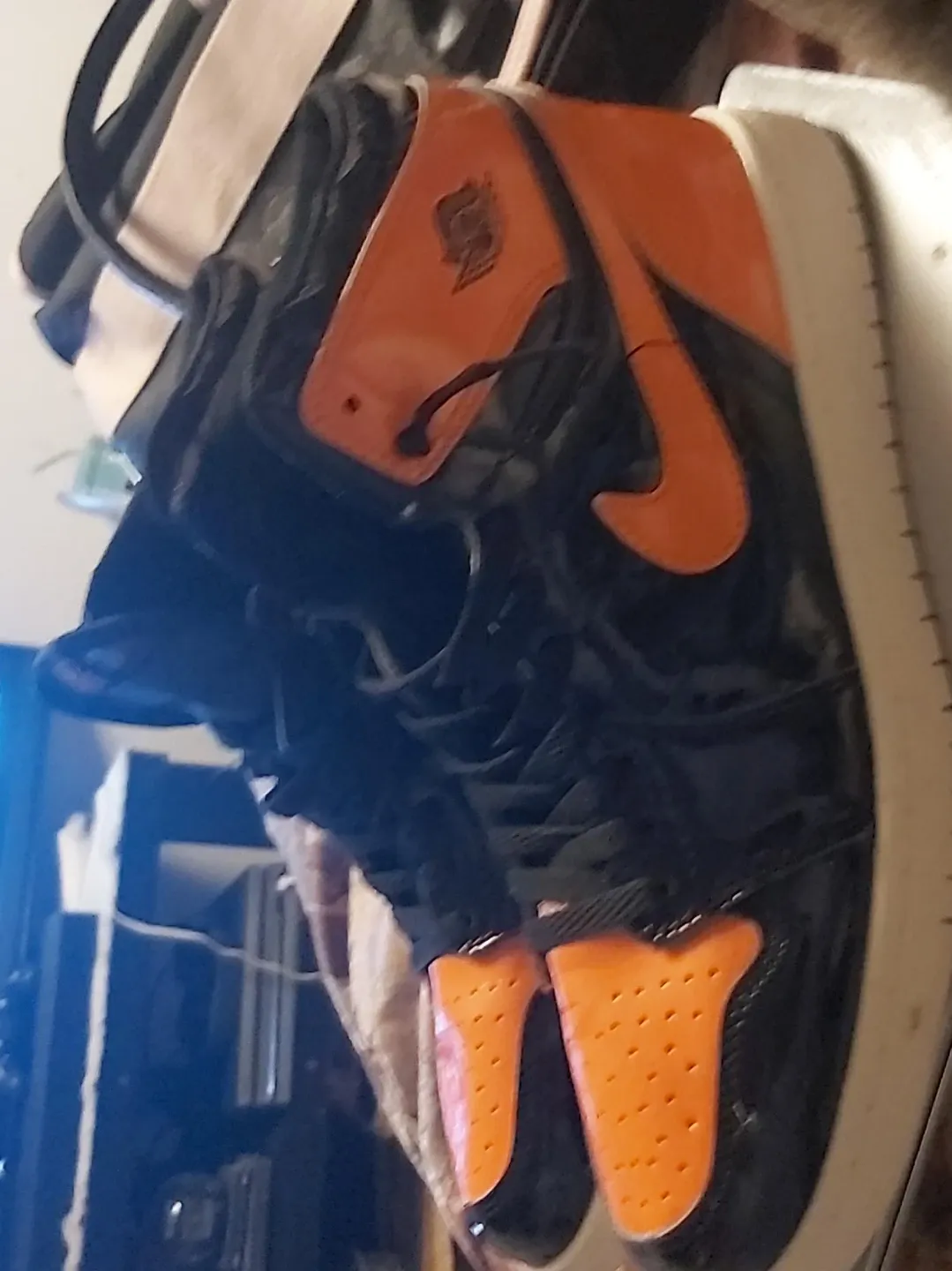 Classic Air Jordan 1 sneakers in the popular "Shattered Backboard" colourway. Features a black and orange patent leather design. These iconic basketball shoes are a must-have for any sneaker enthusiast!