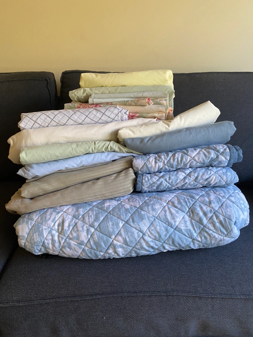 A quilt in excellent condition with matching shams. Three duvet covers. Fitted and flat sheets. Pillow cases.