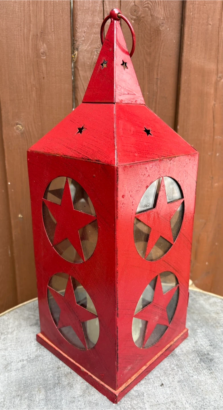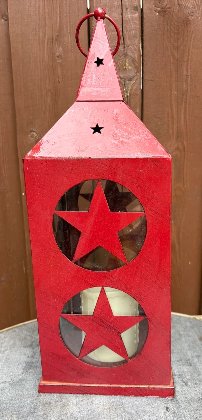 This rustic red metal lantern features charming star cutouts on each side, offering a country-inspired look. It comes with a cream-coloured, drippy wax candle inside for a cozy ambiance. It's perfect for adding a warm glow to your porch or patio.
