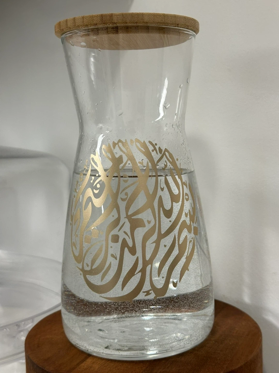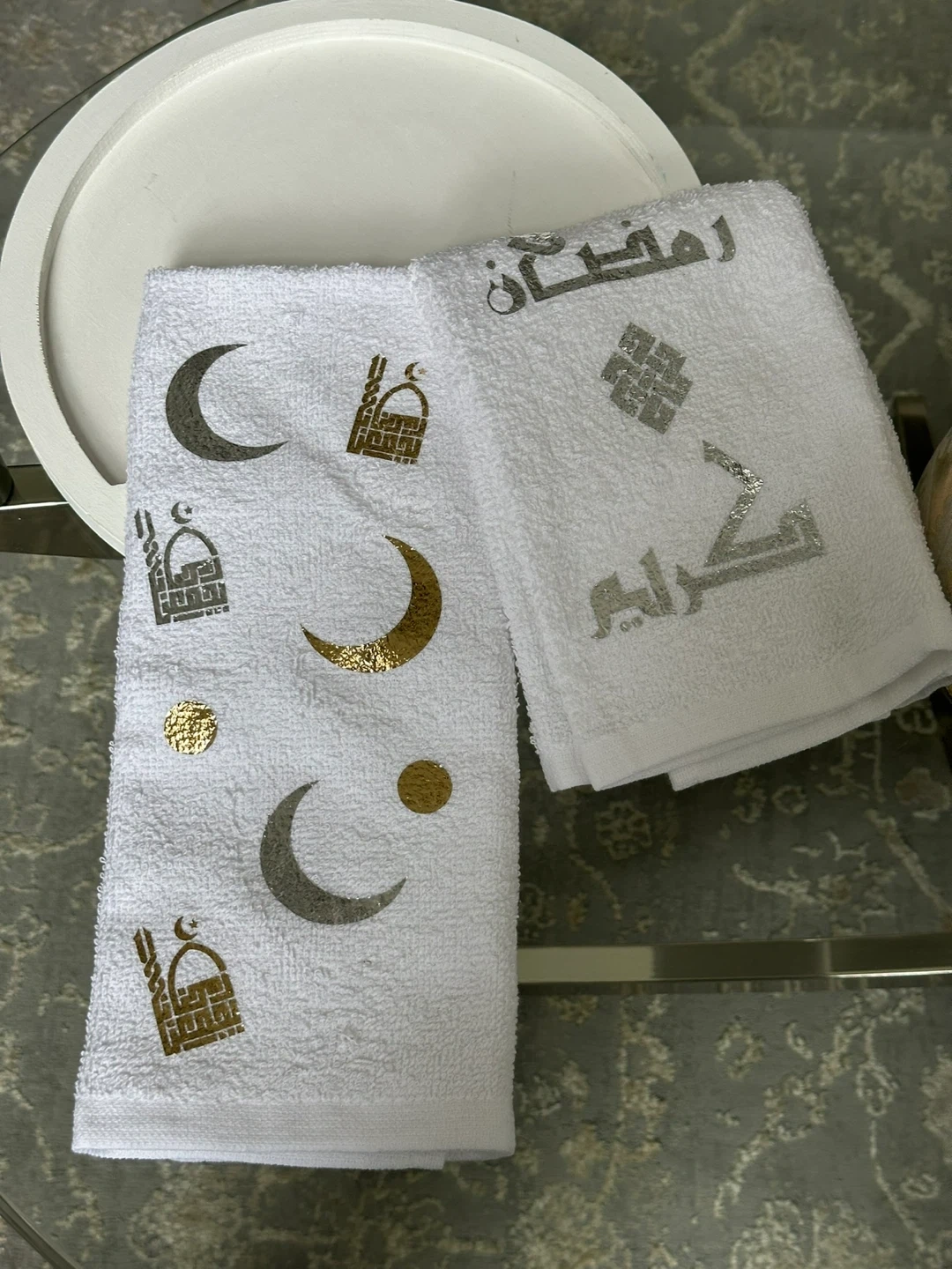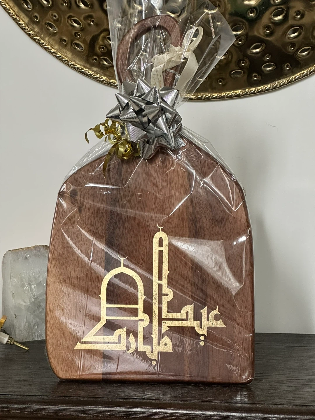 This collection includes a decorative lamp with Arabic calligraphy, a glass pitcher with gold accents, a wooden cutting board, and a set of two towels, all Perfect for Ramadan or Eid decorations, these pieces add a festive touch to your home.