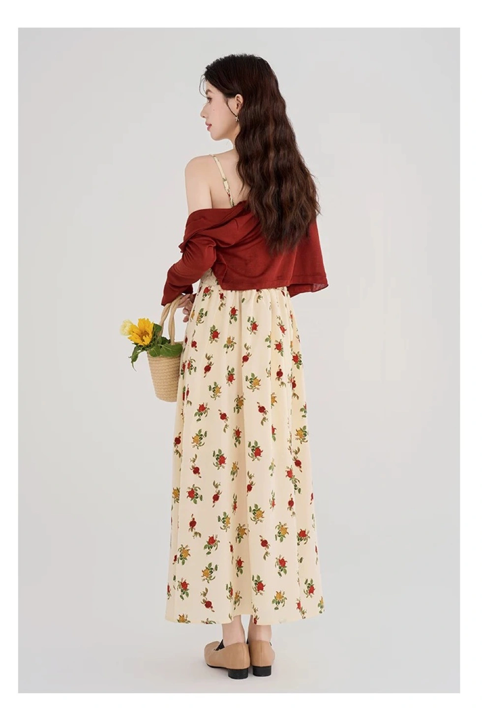 This is a lovely floral print midi dress that comes with a matching cardigan. The dress features a delicate floral pattern and a flattering silhouette. It's perfect for a variety of occasions! The cardigan complements the dress beautifully, adding a touch of warmth and style.