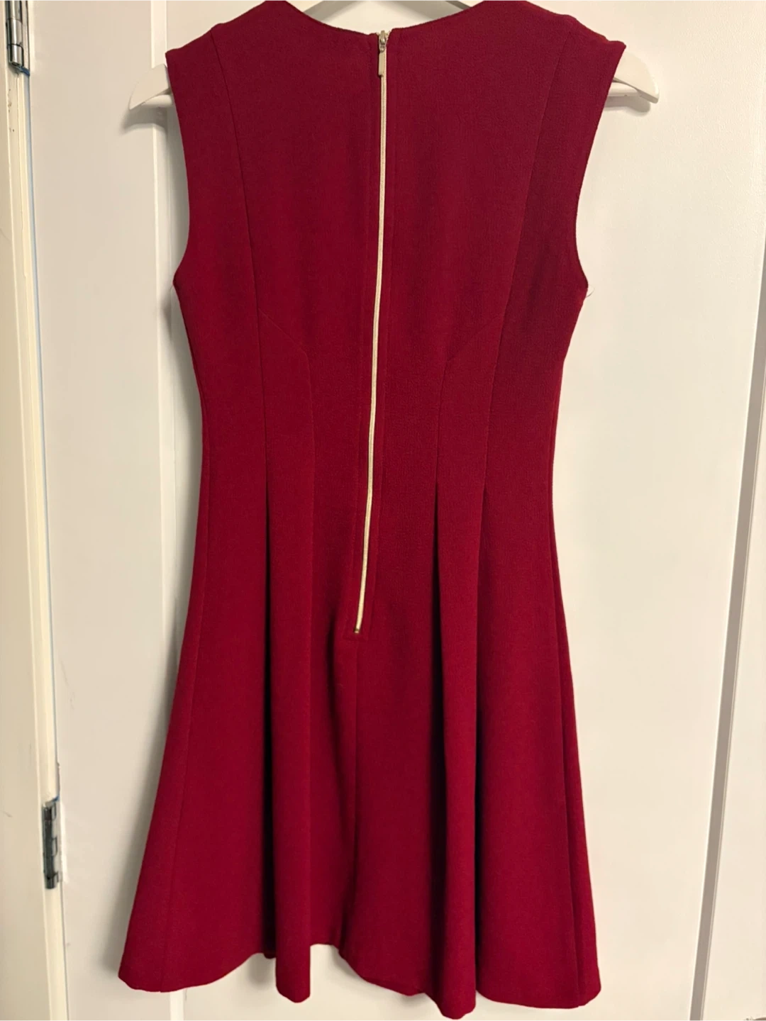 This Dynamite dress is a vibrant red, sleeveless fit and flare style. It features a concealed back zipper for closure. The material feels like a textured crepe. Perfect for dressing up or down!