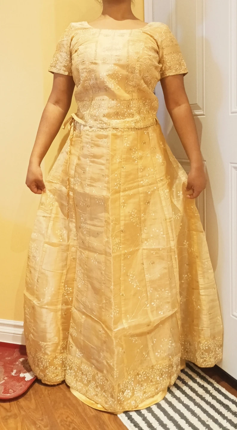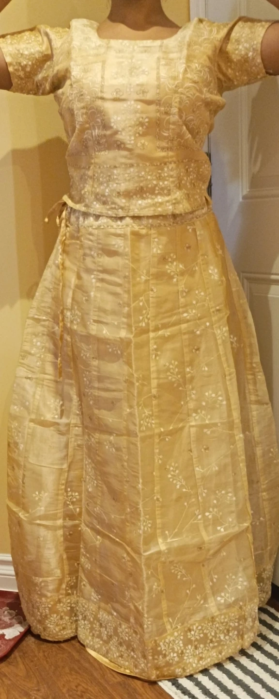 This is a beautiful peach coloured lehenga choli set for girls. It features intricate embroidery throughout the skirt and top. The set includes a top with short sleeves and a matching skirt with a drawstring waist. It's perfect for special occasions and festive events!