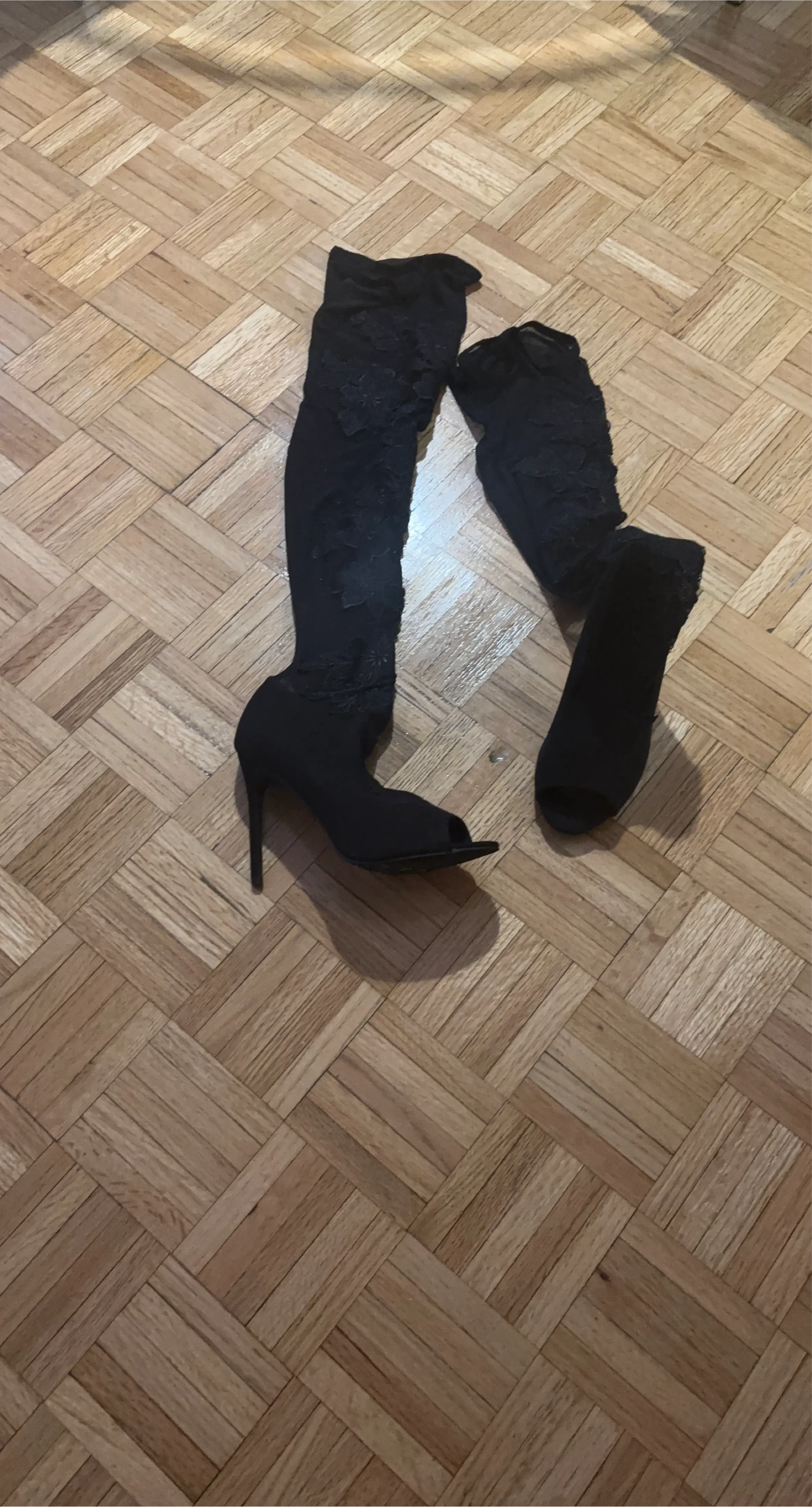 Selling a pair of black peep-toe thigh high heel boots. They have a unique floral lace design on the upper portion of the boot. Perfect for a night out!