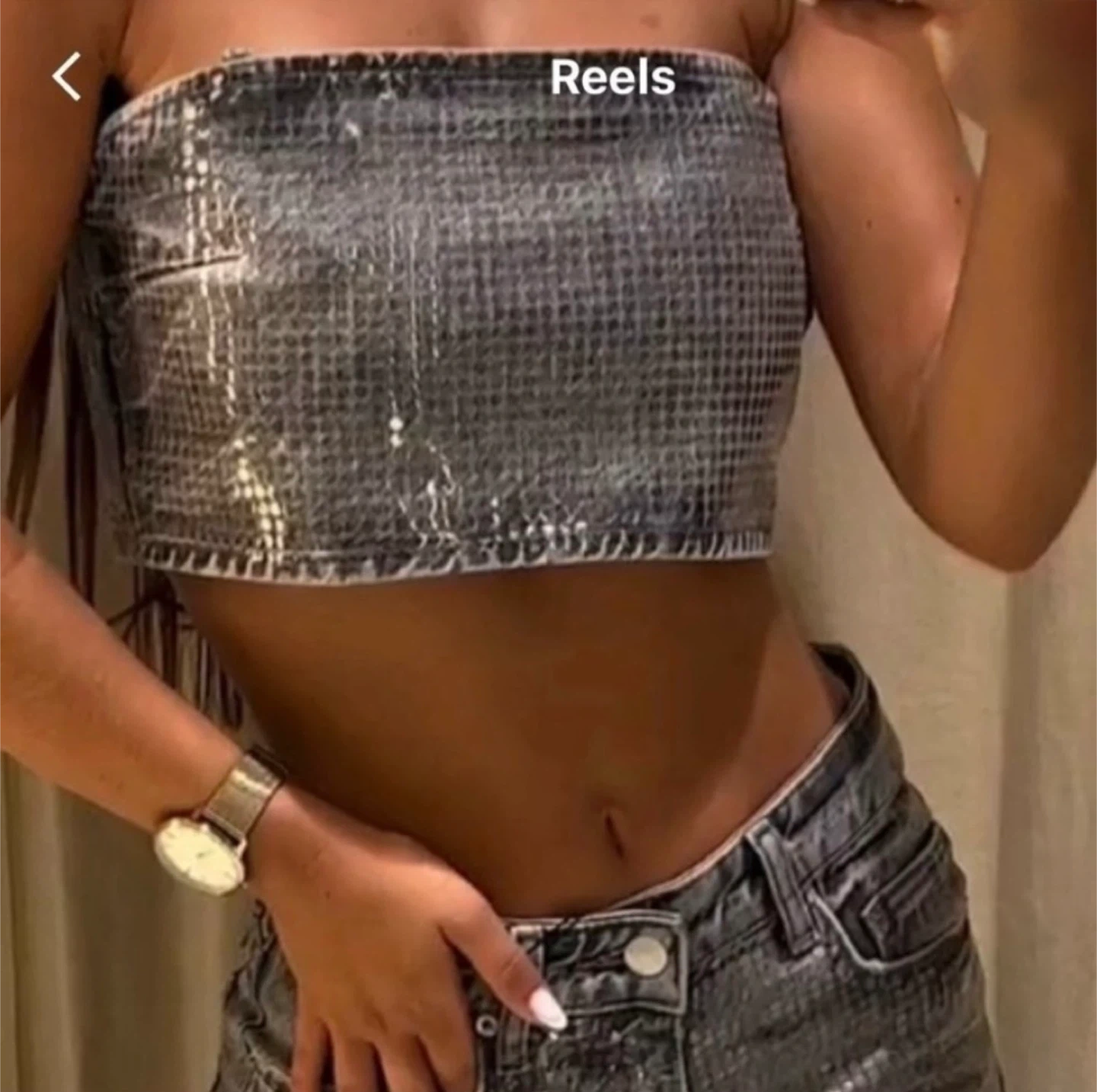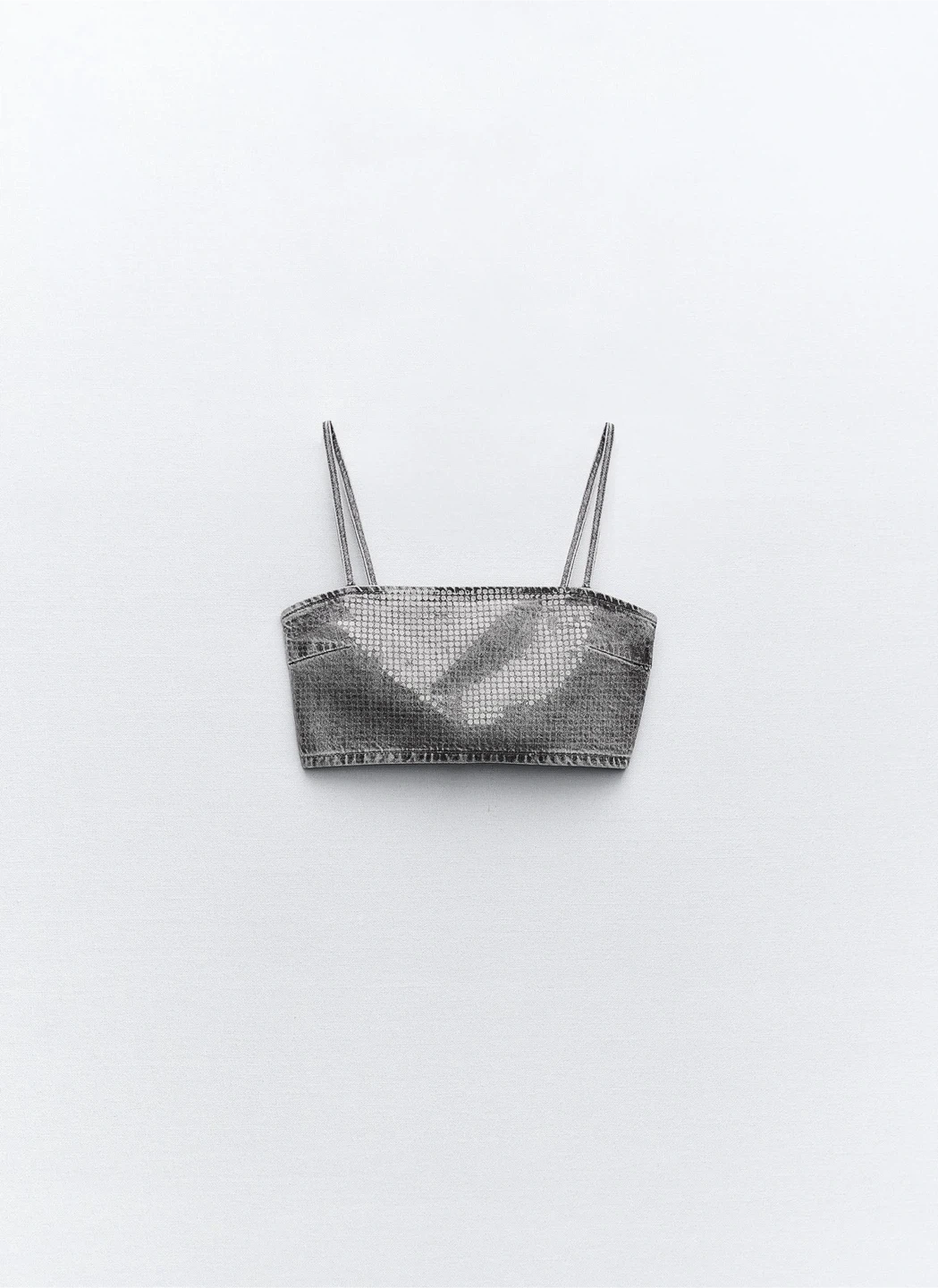 Sparkly grey denim crop top with foil sequin embellishments. It has a zip-up front and thin shoulder straps. Material is denim.