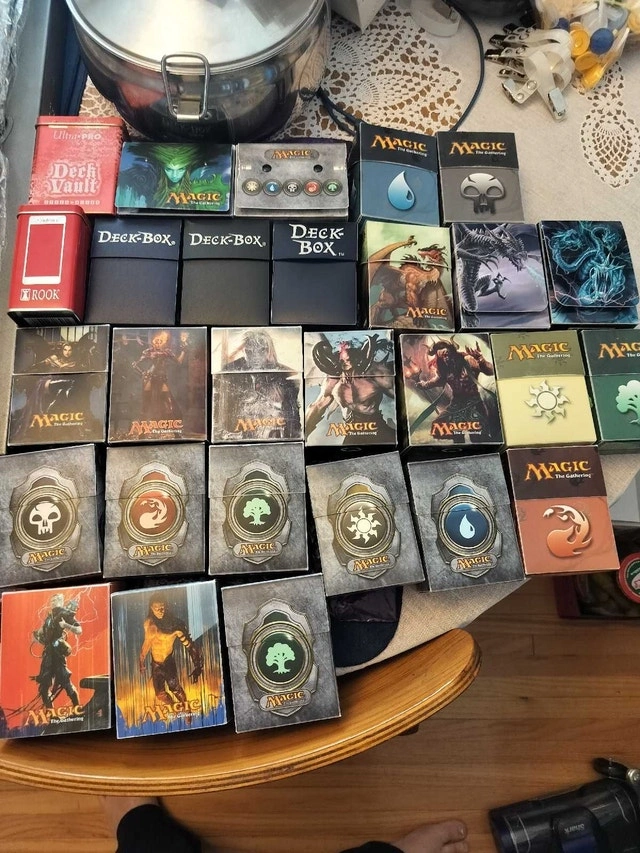Selling a collection of 28 Magic: The Gathering (MTG) deck boxes to keep your valuable cards safe during transport and gameplay. This lot includes a variety of styles and designs, offering something for every MTG enthusiast. These are used items and might show minor signs of wear, but are all in good, usable condition. Organize your decks in style with these sturdy containers! Features a variety of designs including different colors, artwork, Mana symbols, planeswalkers, elder dragons, and general dragons. Some are metal and some are plastic. Each box holds up to 75 sleeved cards. These deck boxes are perfect for storing and protecting your MTG decks. Similar deck boxes sell for $5-$15 each on Kijiji. Sold as a lot. Pickup only, cash only.