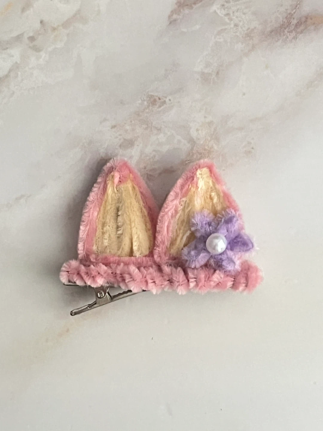 Cute plush cat ear hair clip with pink and yellow fur. It's adorned with a purple flower and a faux pearl. Secure metal clip attached.