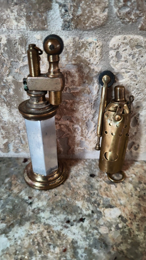 Selling a set of vintage brass blowtorch lighters. They have a unique design and are made of brass. They would make a great addition to any collection! Larger one needs flint, smaller one lights uses liquid fuel. $10 each