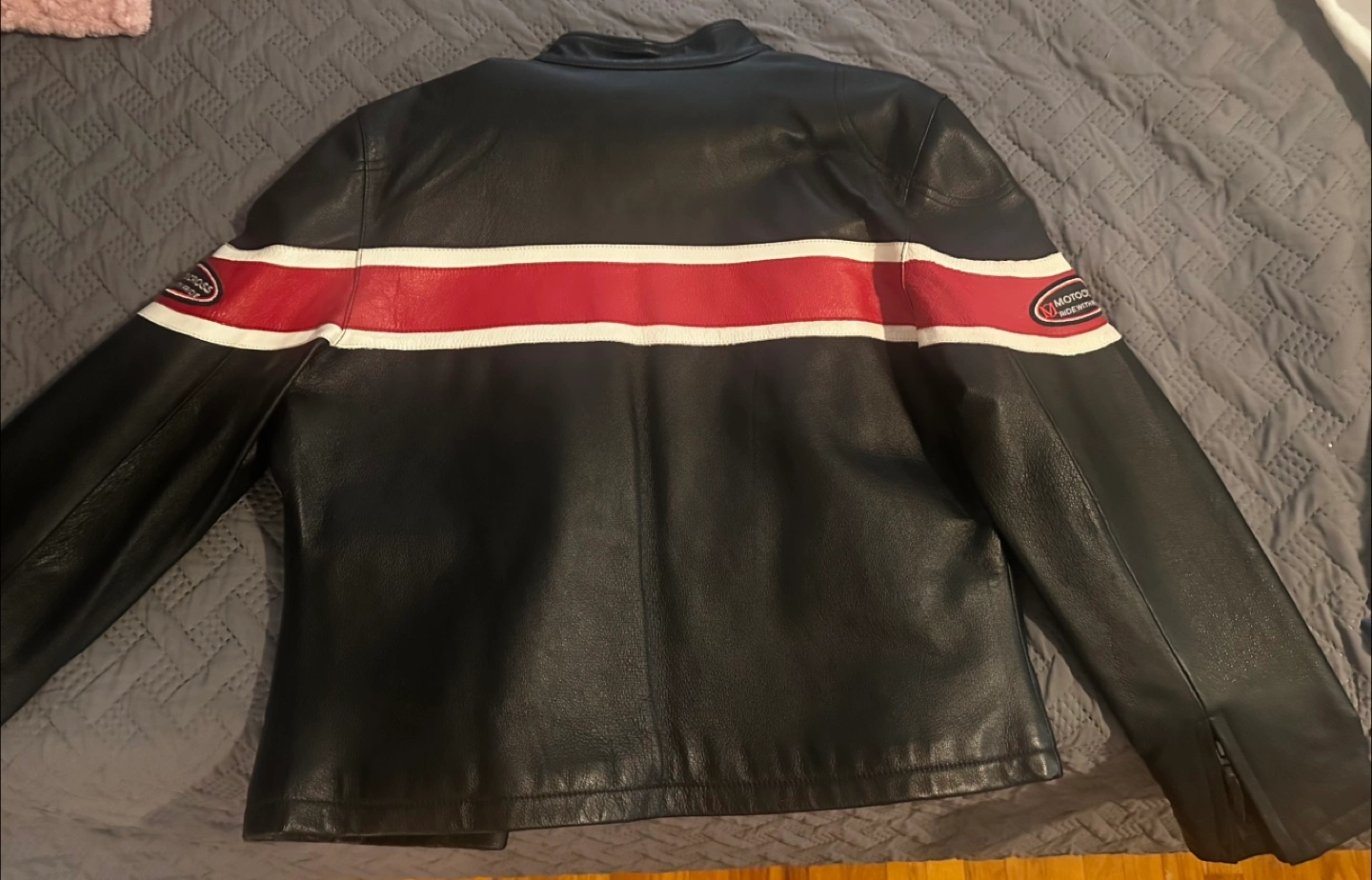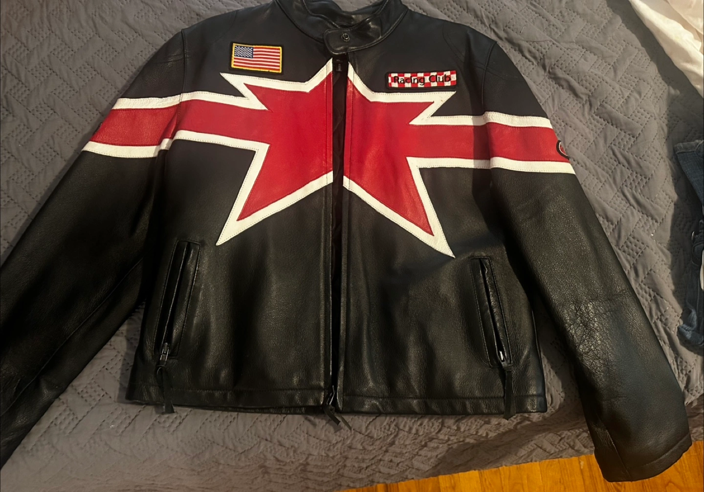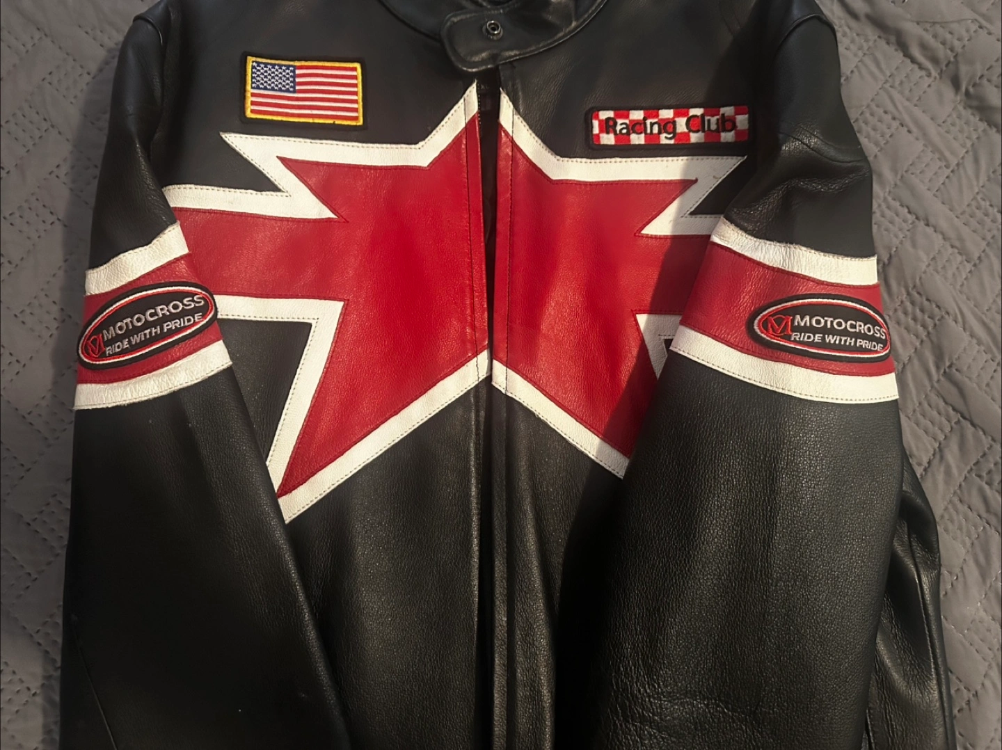 Selling a Marcia Racing Club leather jacket in size XL. It's black with a red and white star design on the front and has "Racing Club" and "Motocross Ride With Pride" patches. The jacket also features an American flag patch. The inside is lined with a quilted material.like new ,No tares ,Serious buyers ,Pick up only