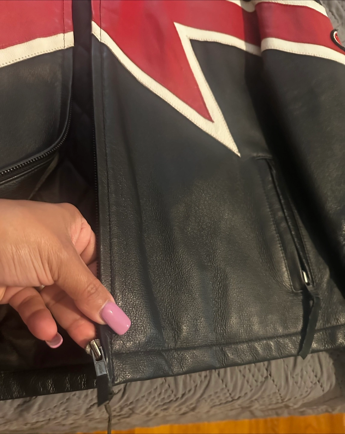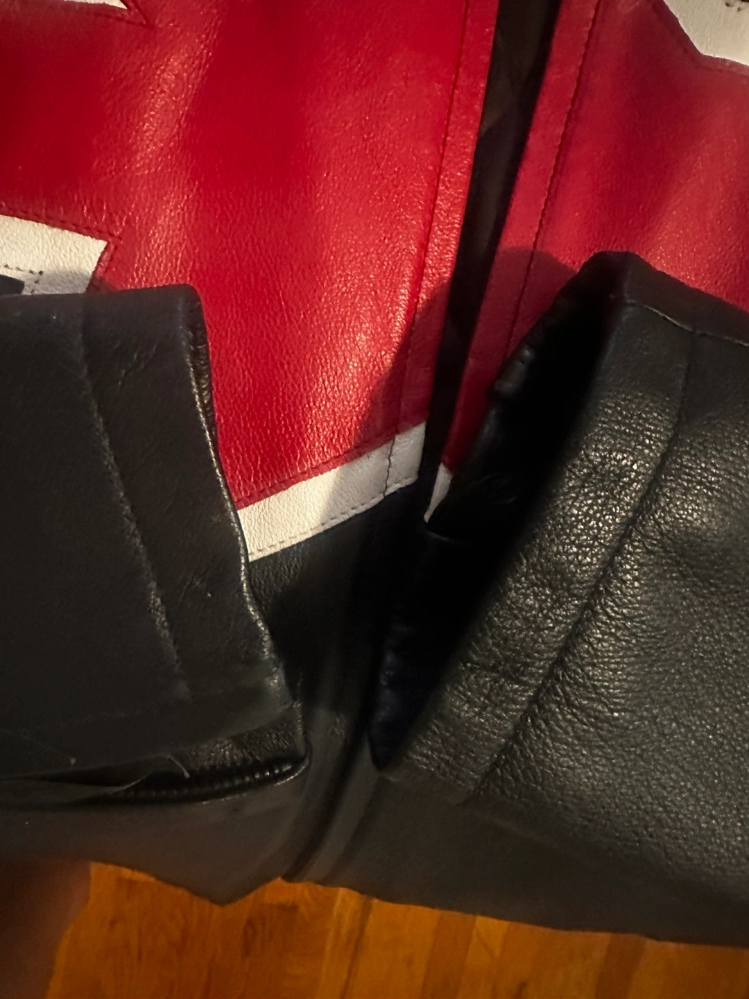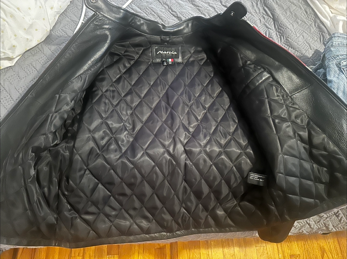 Selling a Marcia Racing Club leather jacket in size XL. It's black with a red and white star design on the front and has "Racing Club" and "Motocross Ride With Pride" patches. The jacket also features an American flag patch. The inside is lined with a quilted material.like new ,No tares ,Serious buyers ,Pick up only