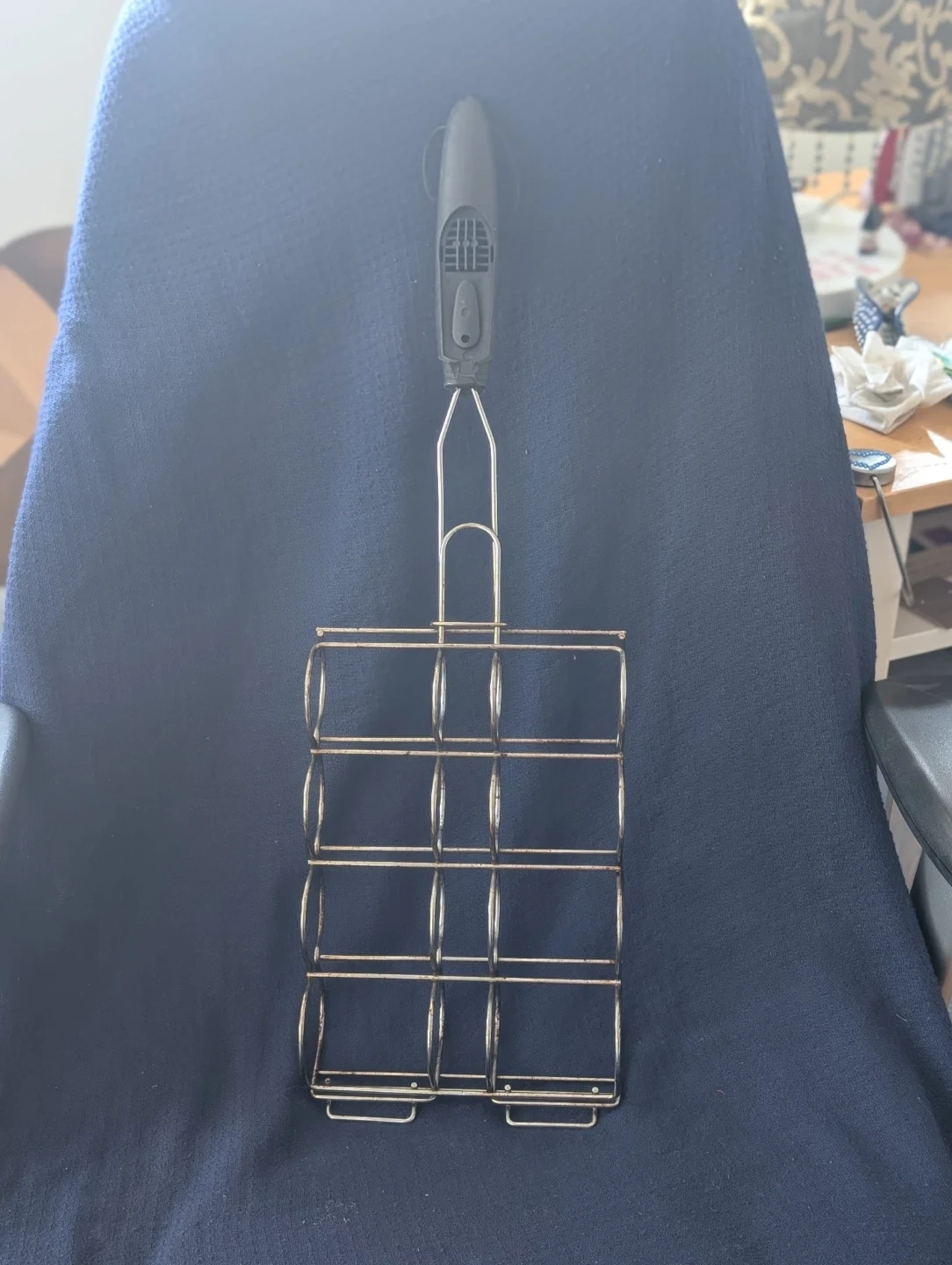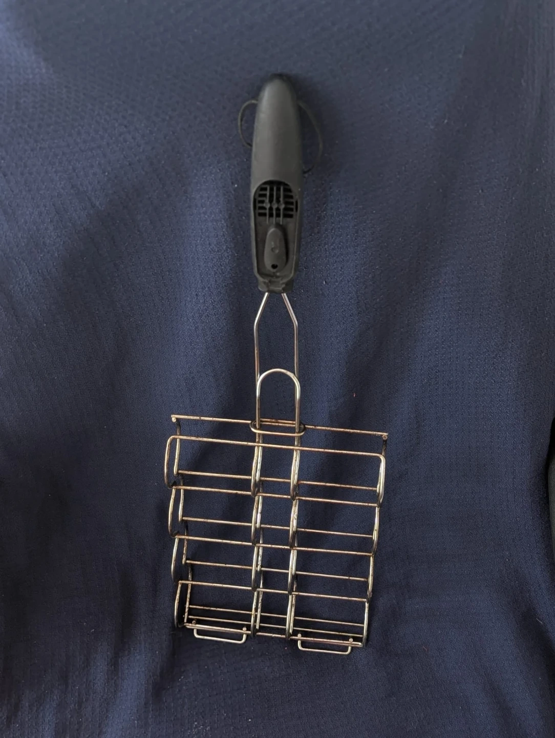 This is a metal grill basket with a black plastic handle. It's designed to hold food securely while grilling. The basket has a wireframe construction.