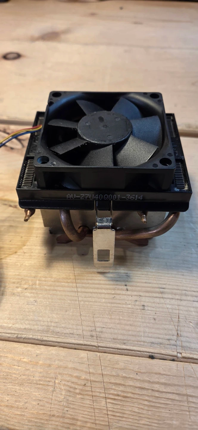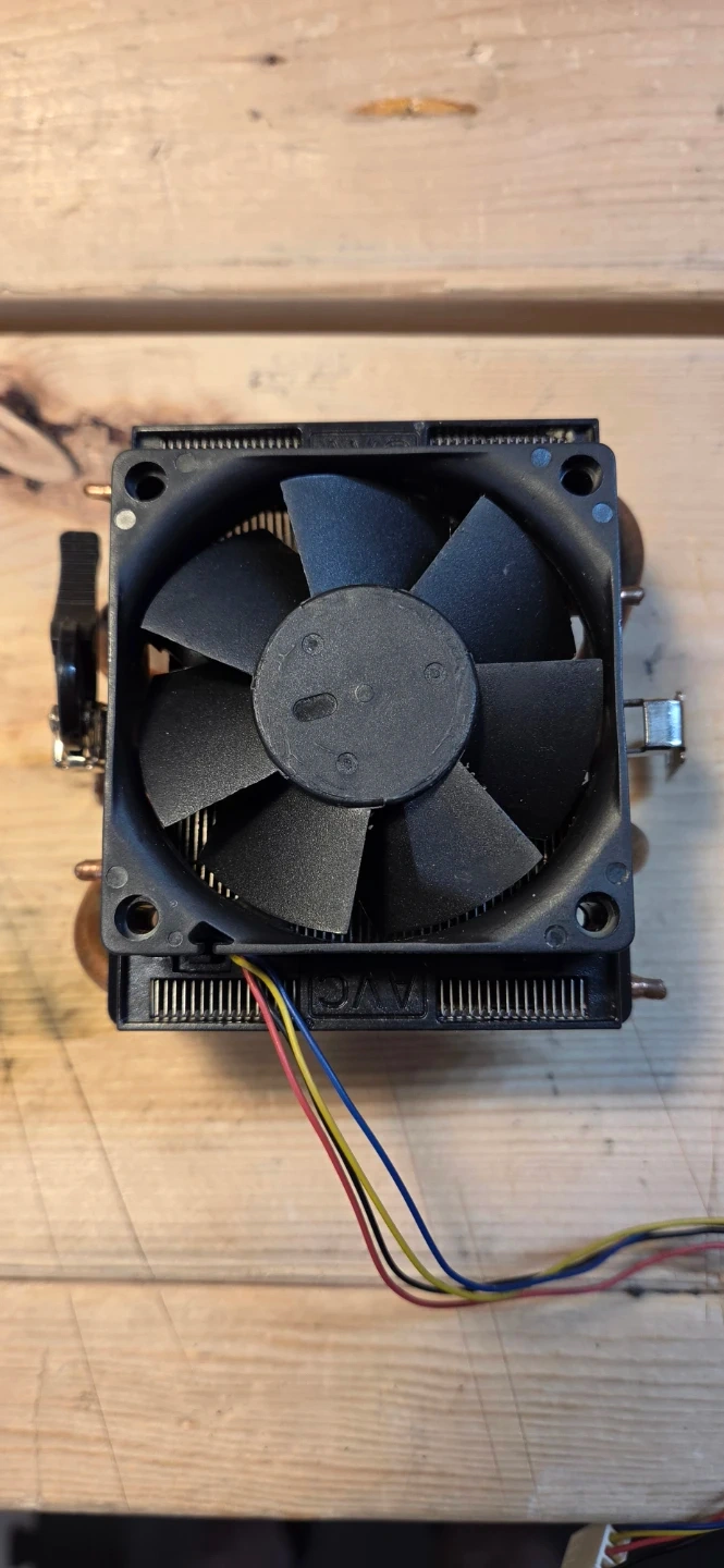 This is an AVC CPU cooler fan with copper heatpipes. It has a black fan and a metal mounting bracket. The fan spins freely and all wires appear are intact.