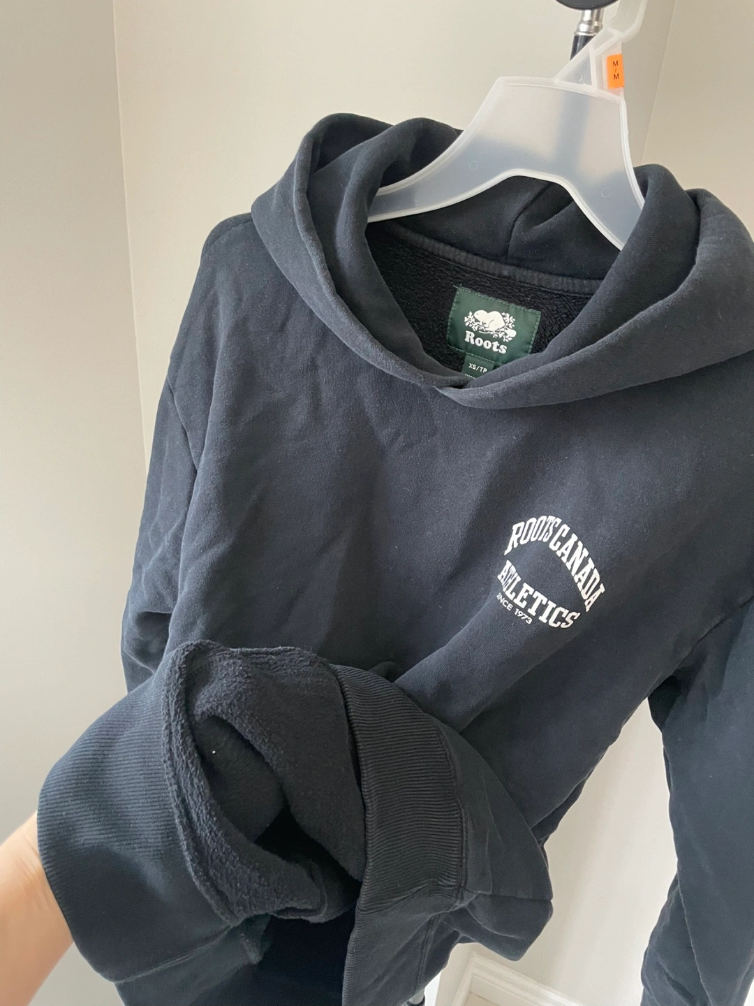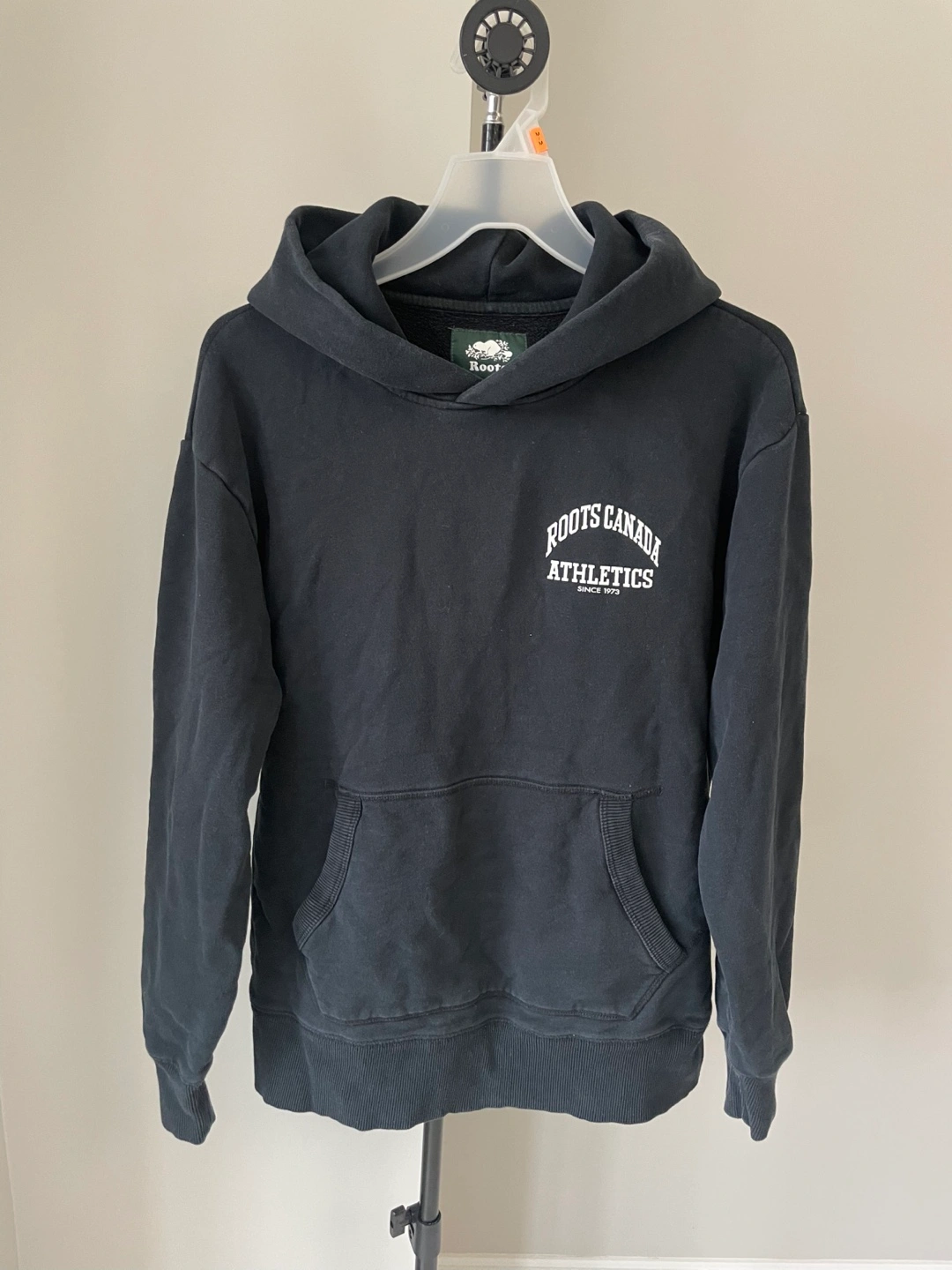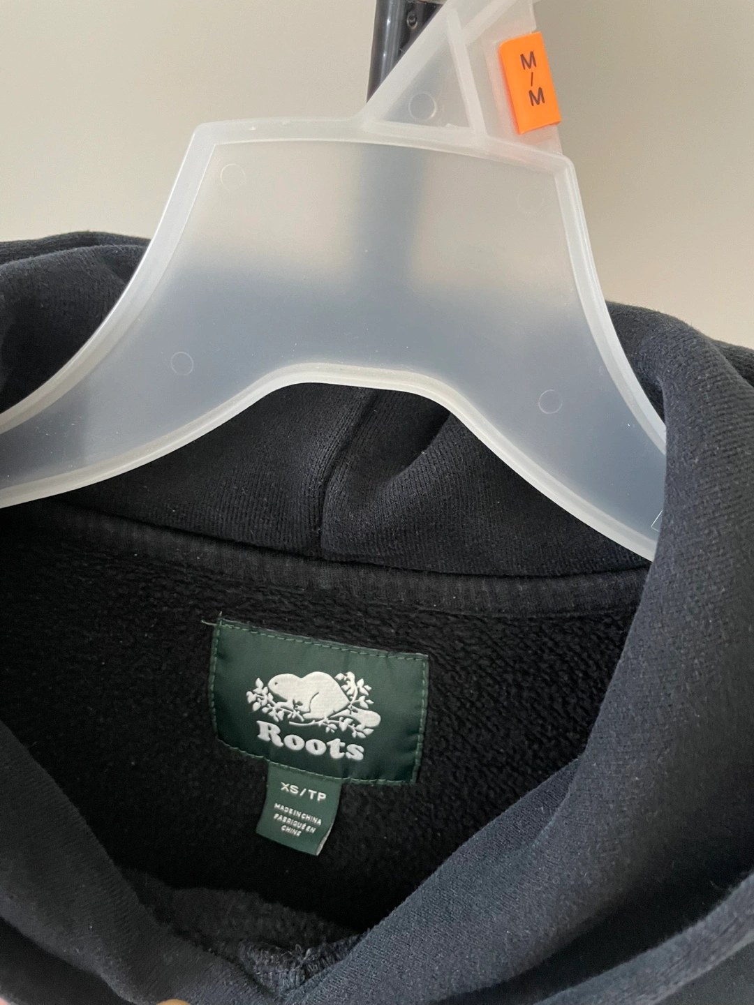 This is a black Roots Canada Athletics hoodie. It's a size XS/TP. Made in China.
