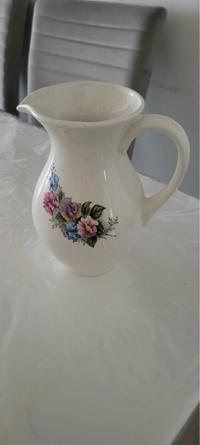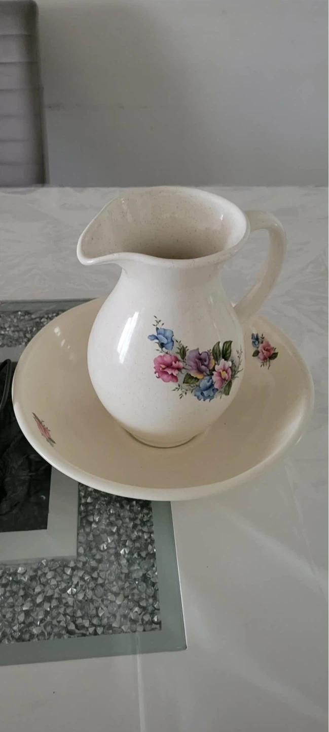 This is a vintage ceramic pitcher and basin set. It features a cream-coloured base with a delicate floral pattern. Perfect for a bathroom vanity or as a decorative piece.