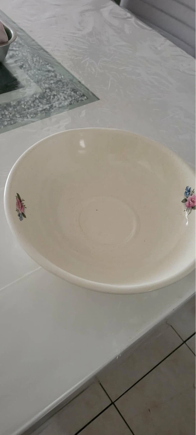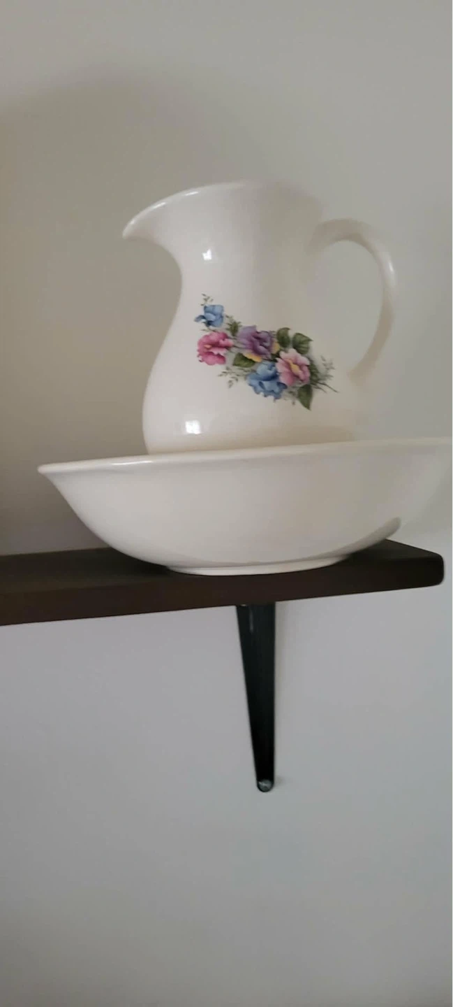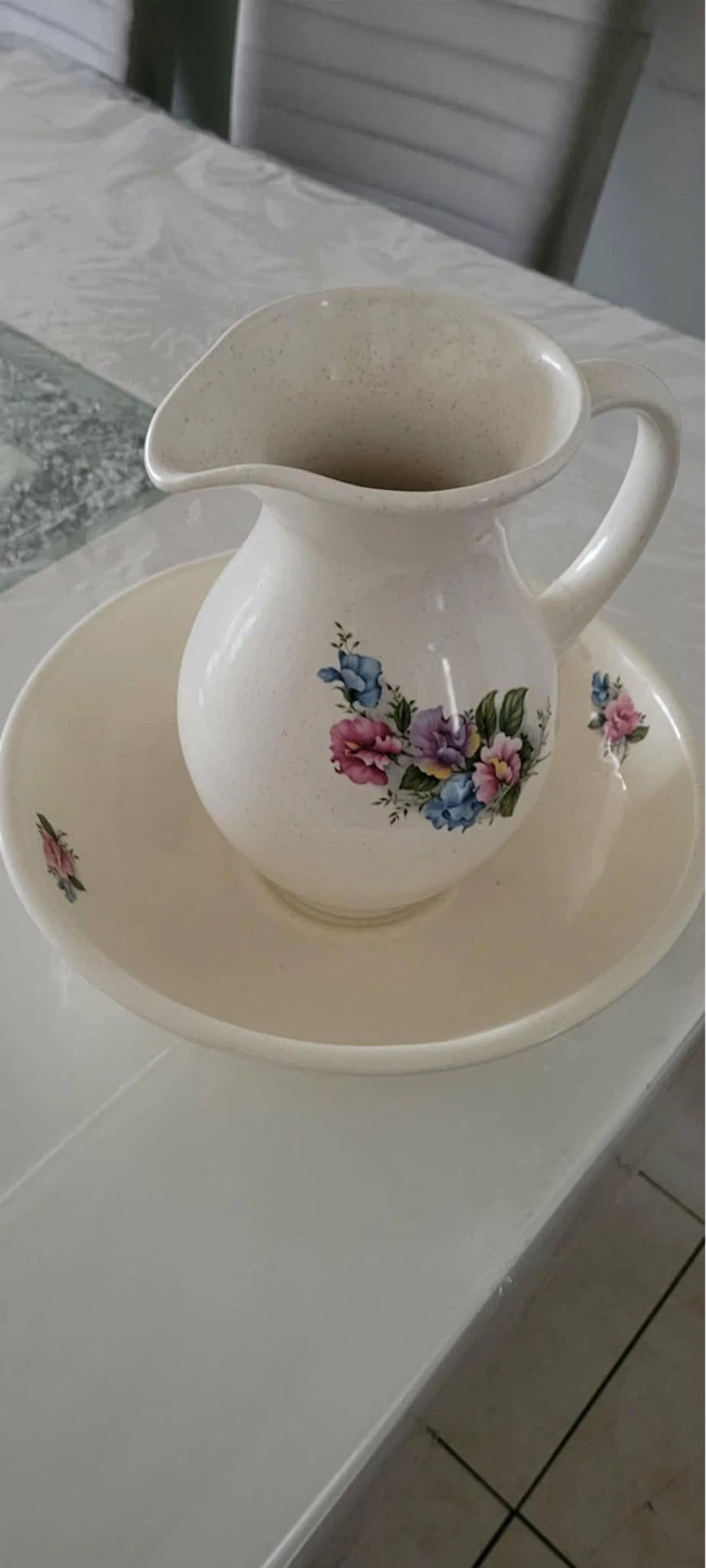 This is a vintage ceramic pitcher and basin set. It features a cream-coloured base with a delicate floral pattern. Perfect for a bathroom vanity or as a decorative piece.