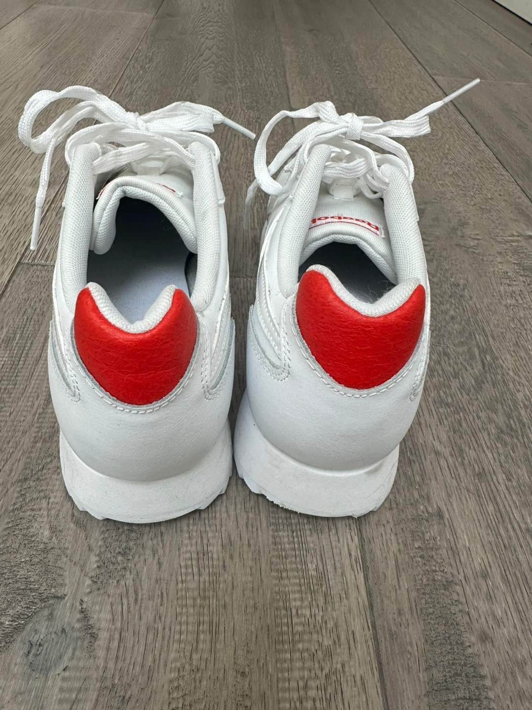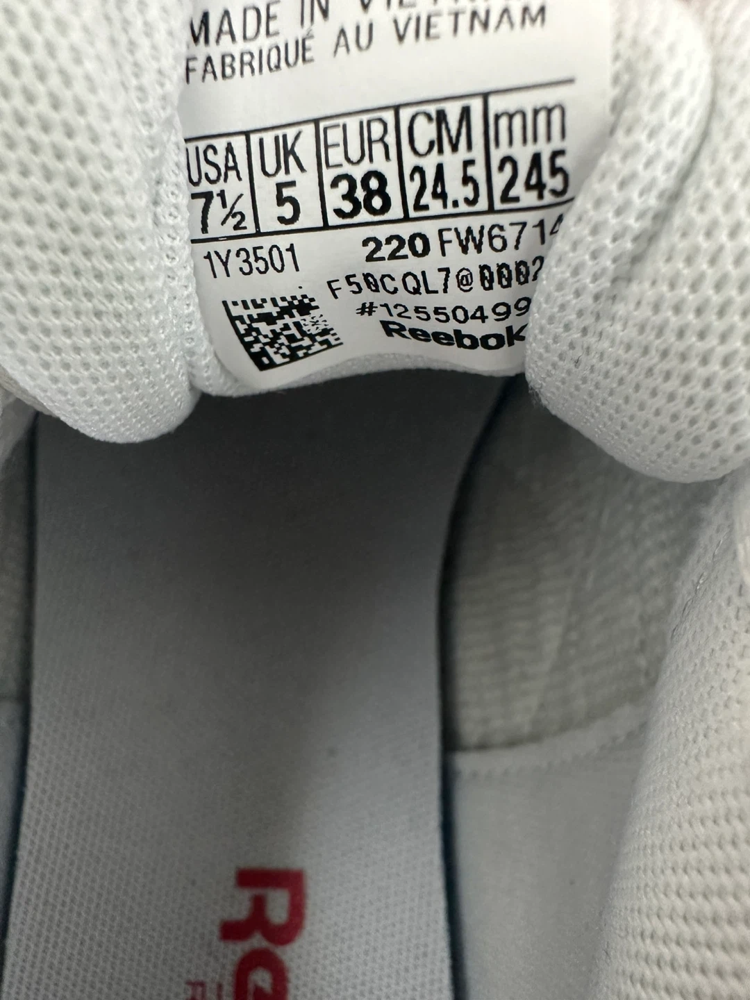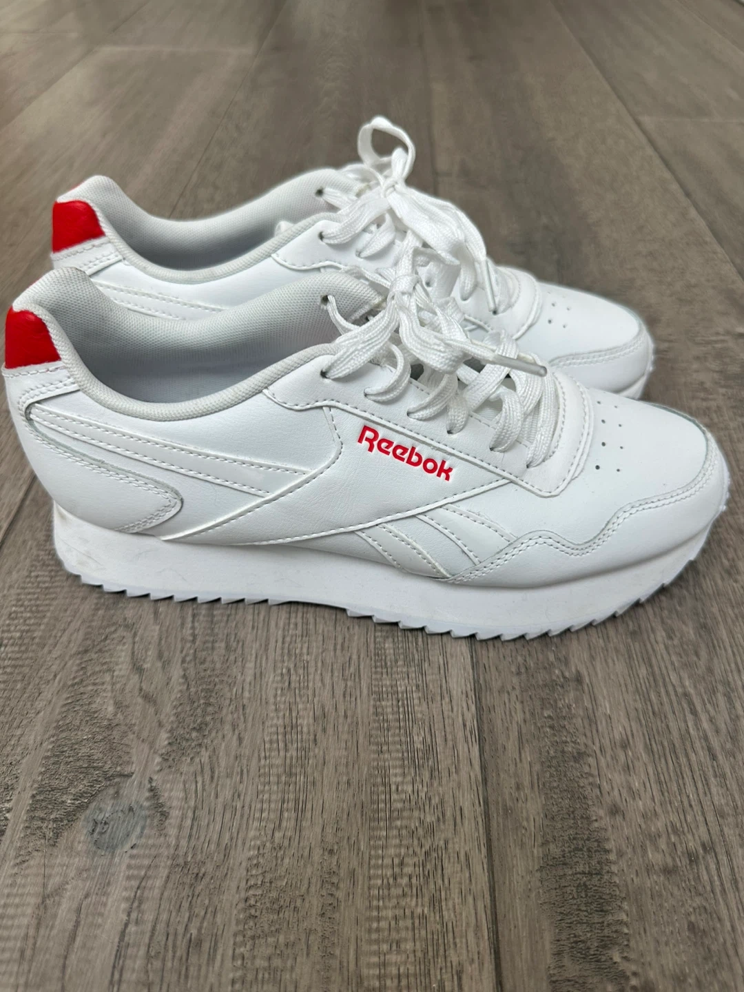 The Reebok Royal Glide Ripple Double (style FW6714) is a women's casual sneaker featuring a white upper with red accents, a distinct, chunky, ripple-style outsole, and a durable synthetic leather construction. Designed for everyday comfort and style, this shoe offers a modern, elevated take on the classic Reebok Shoe size is US women's 7.5, UK 5, EUR 38, and CM 24.5.