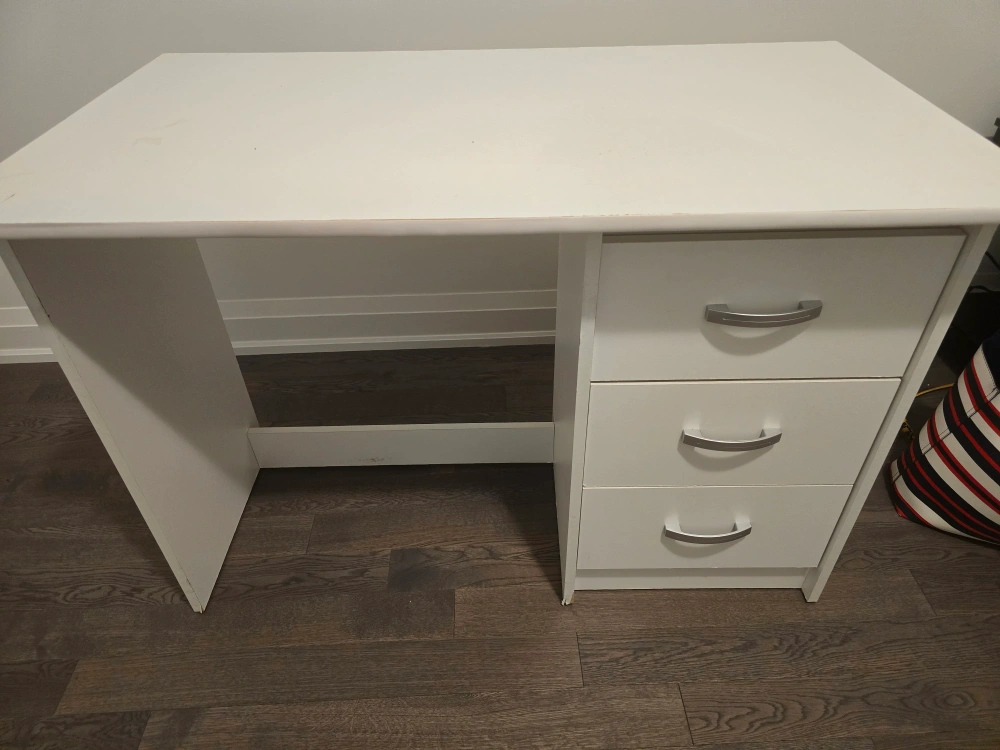 A simple white desk with three drawers for storage. It's made of a composite material and features silver drawer pulls. This desk would be useful for a home office or study space. very easy to lift and load into a van.