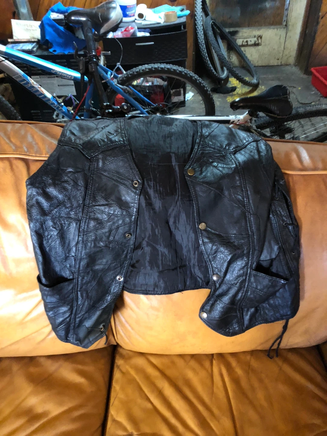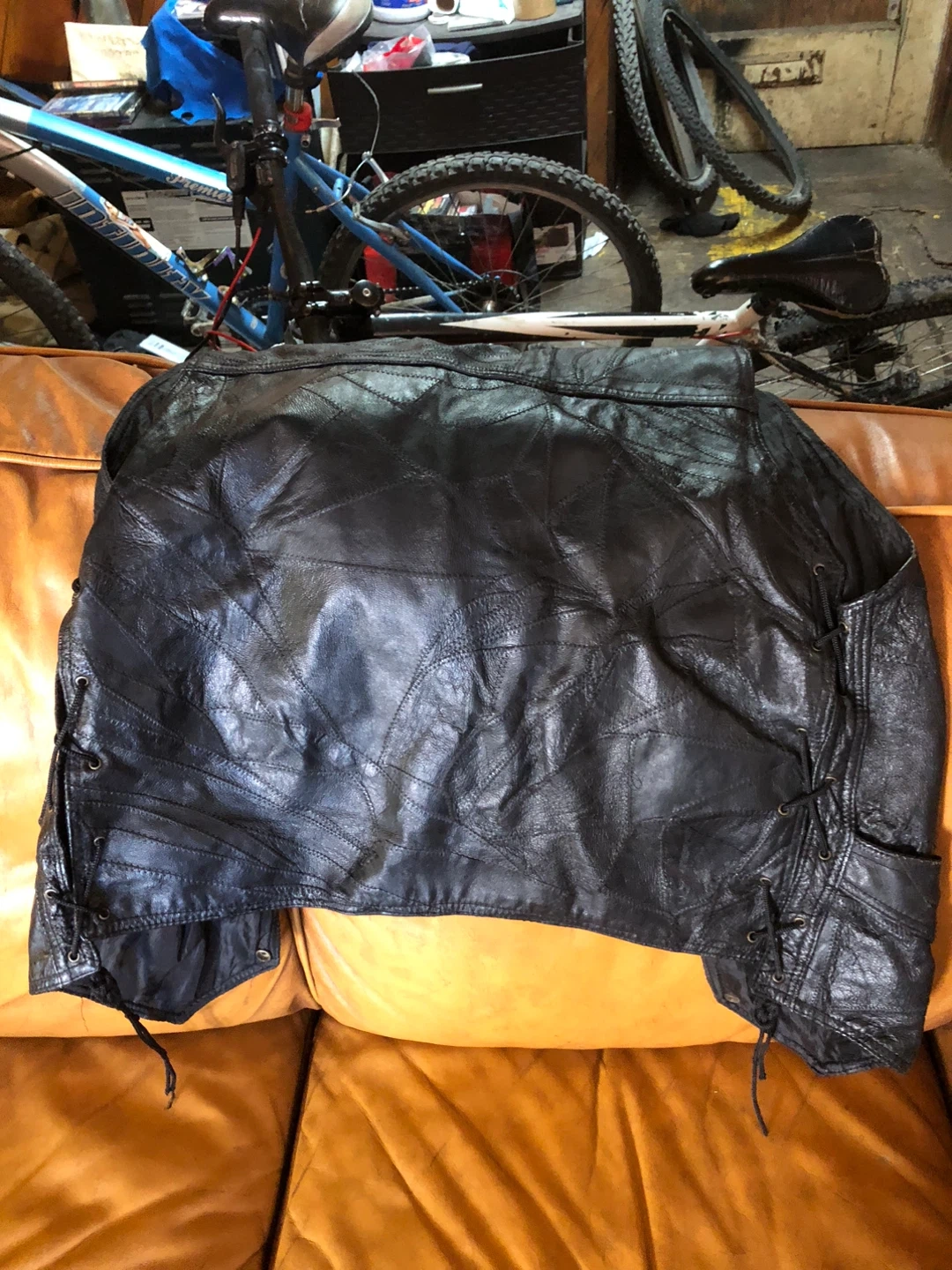 This black leather jacket features a unique patchwork design with lace-up detailing on the sides. It's a classic motorcycle style. This jacket is great for riders and fashion enthusiasts alike!