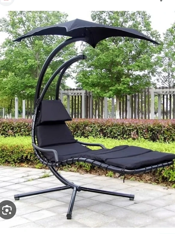Black outdoor lounge chair with a built-in canopy for sun protection. It features a curved frame with a padded seat and headrest. Perfect for relaxing on a patio or in the backyard!