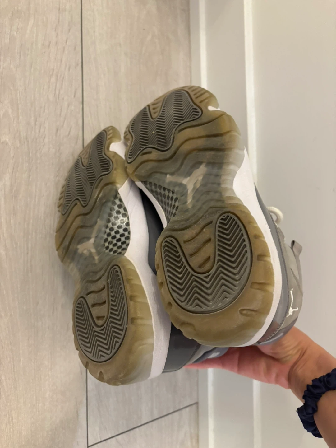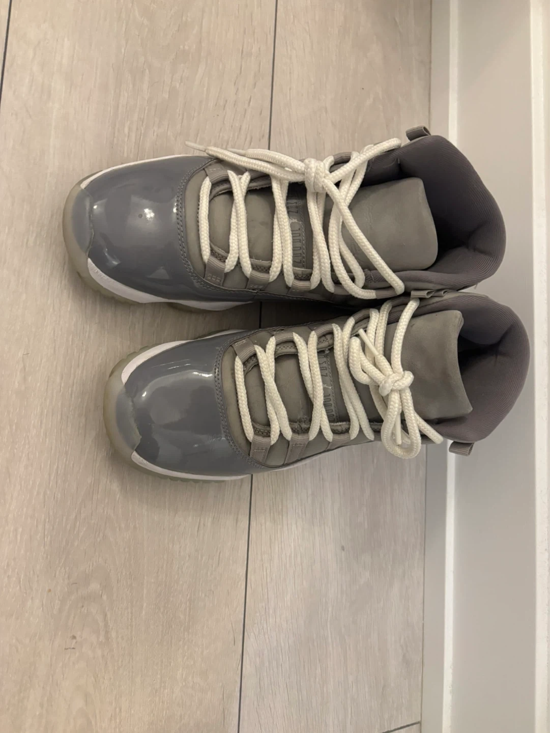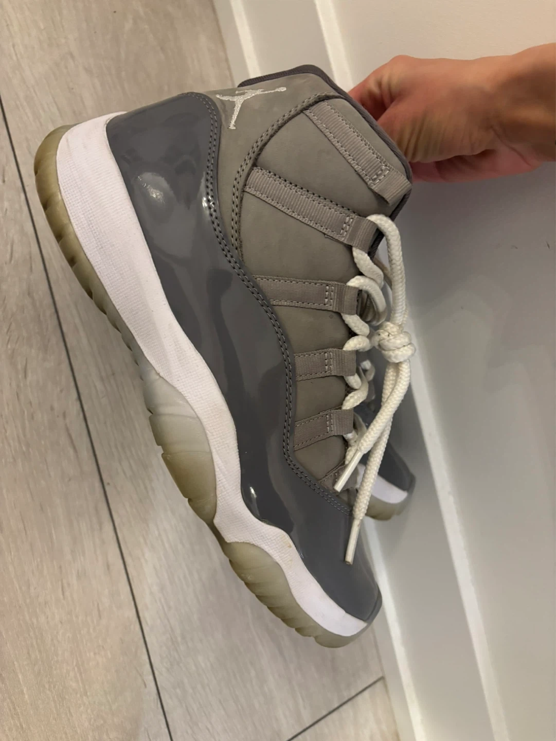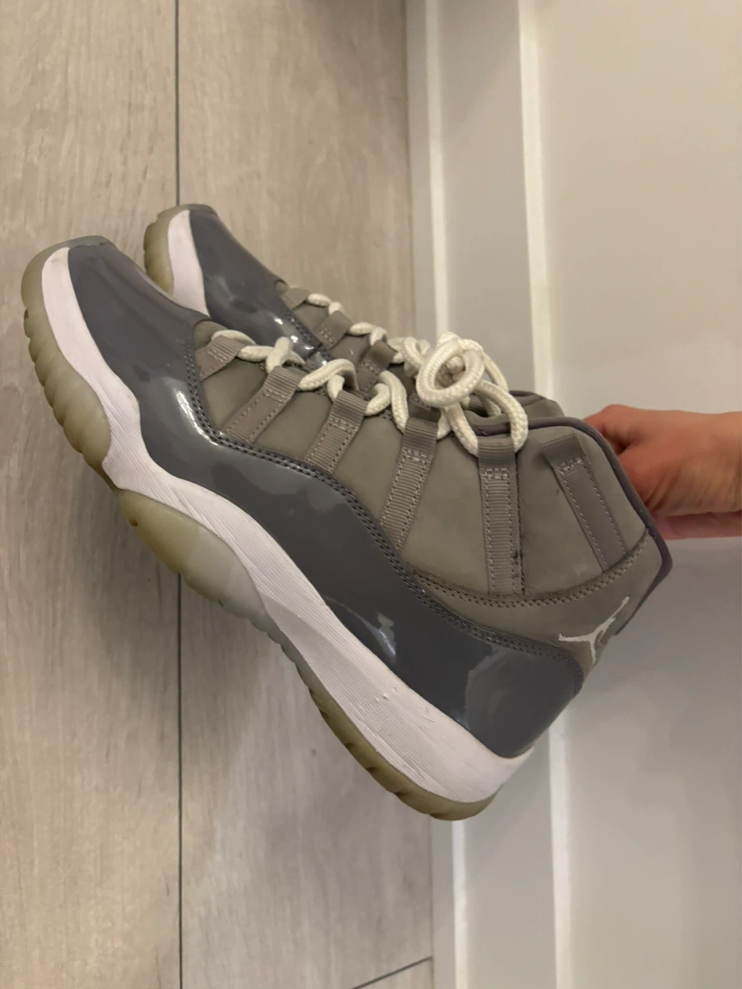 These Air Jordan 11 Retro sneakers are in the 'Cool Grey' colourway. They feature a patent leather and nubuck upper with white laces and a white midsole. The translucent outsole has a grippy tread pattern. Ready for a new owner!