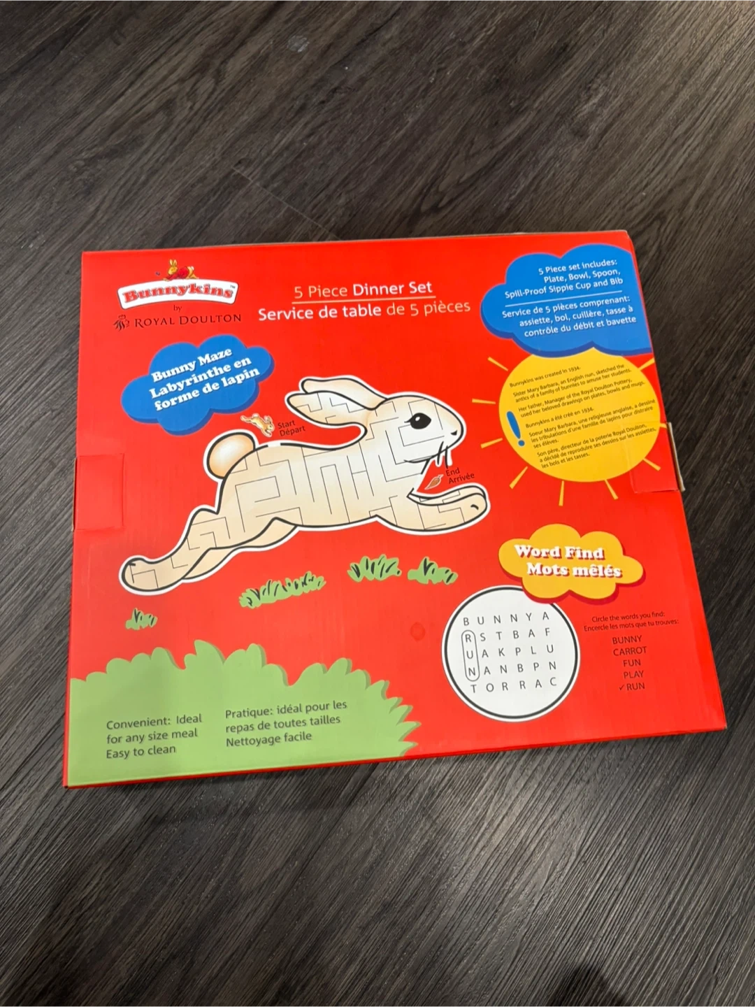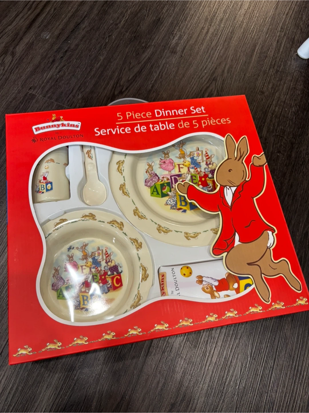 Selling a brand new Royal Doulton Bunnykins 5-piece dinner set! It includes a plate, bowl, cup, spoon, and bib. It's a super cute set, perfect for any size meal and easy to clean up after.