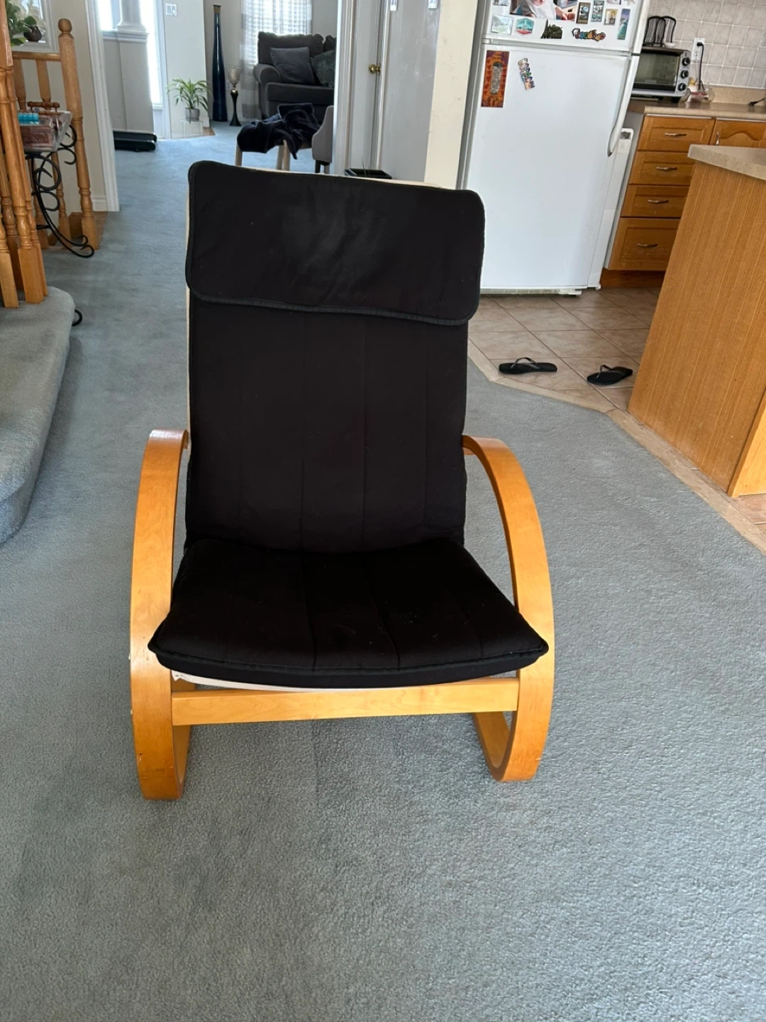This is a black rocker chair with a natural wood frame. It features comfortable black cushioning. It's a nice addition to a living room or nursery.