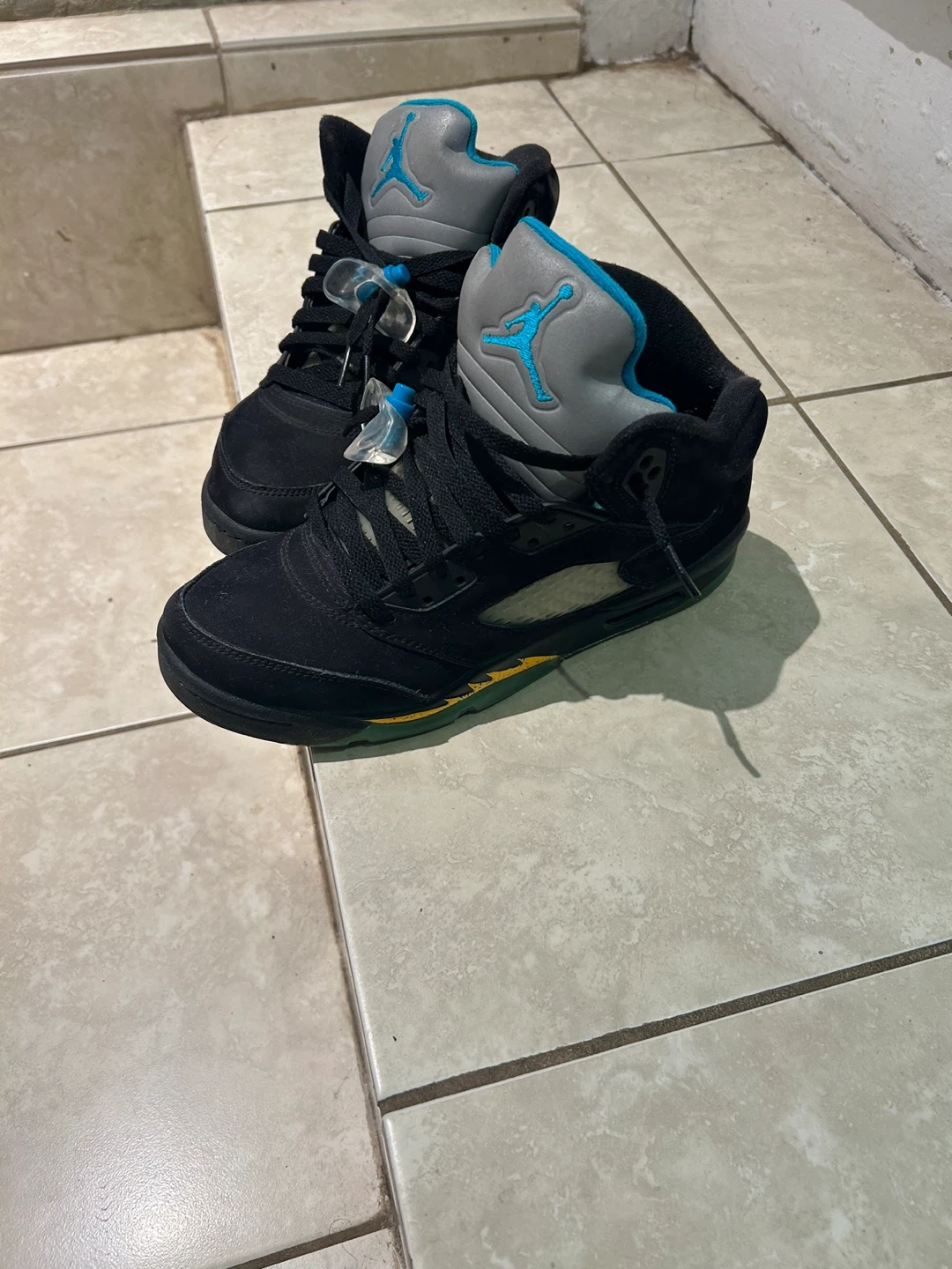 These are Air Jordan 5 Retro sneakers. Black suede uppers with grey and teal accents. Features the Jumpman logo. Excellent for basketball or casual wear!
