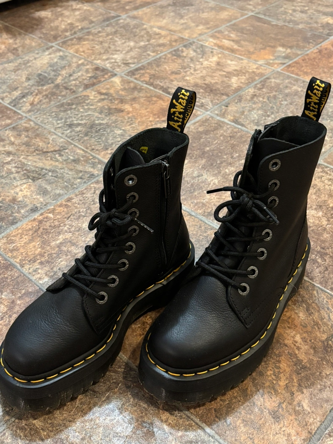Women's black leather platform boots. Lace-up style with side zip. Thick platform sole. Excellent condition. Comes with original box.