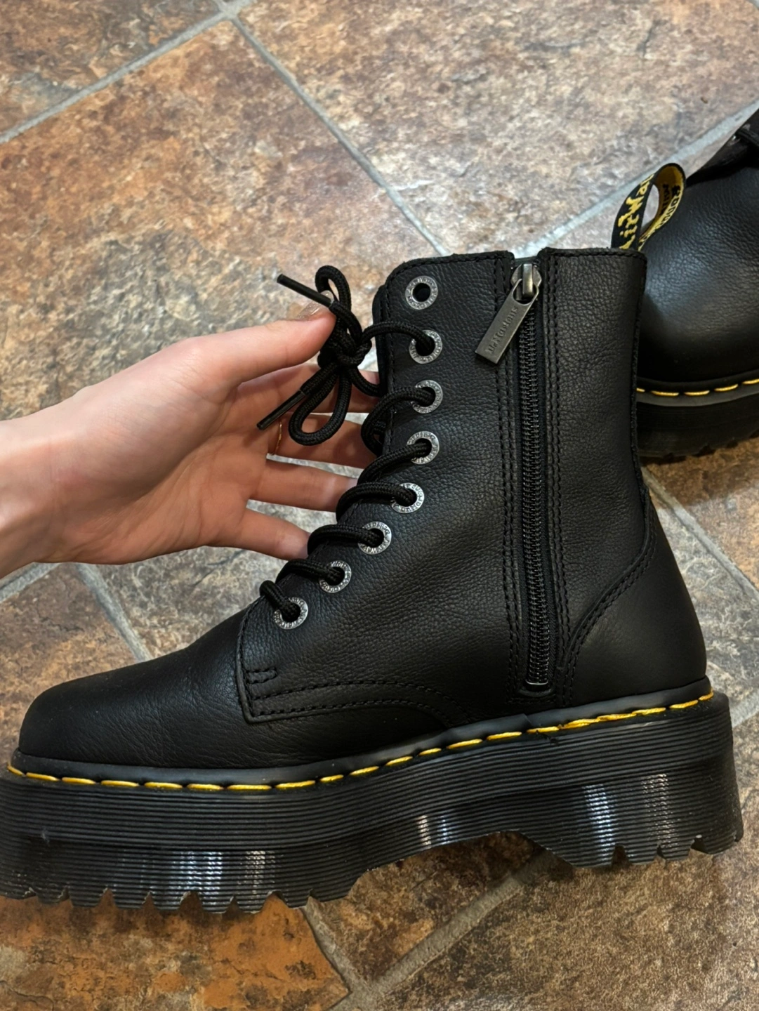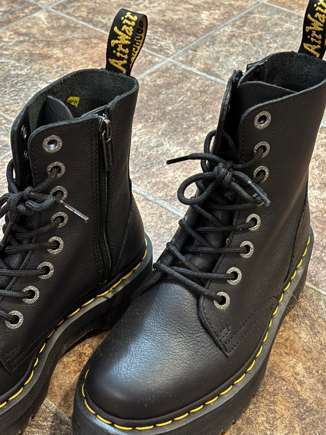 Women's black leather platform boots. Lace-up style with side zip. Thick platform sole. Excellent condition. Comes with original box.