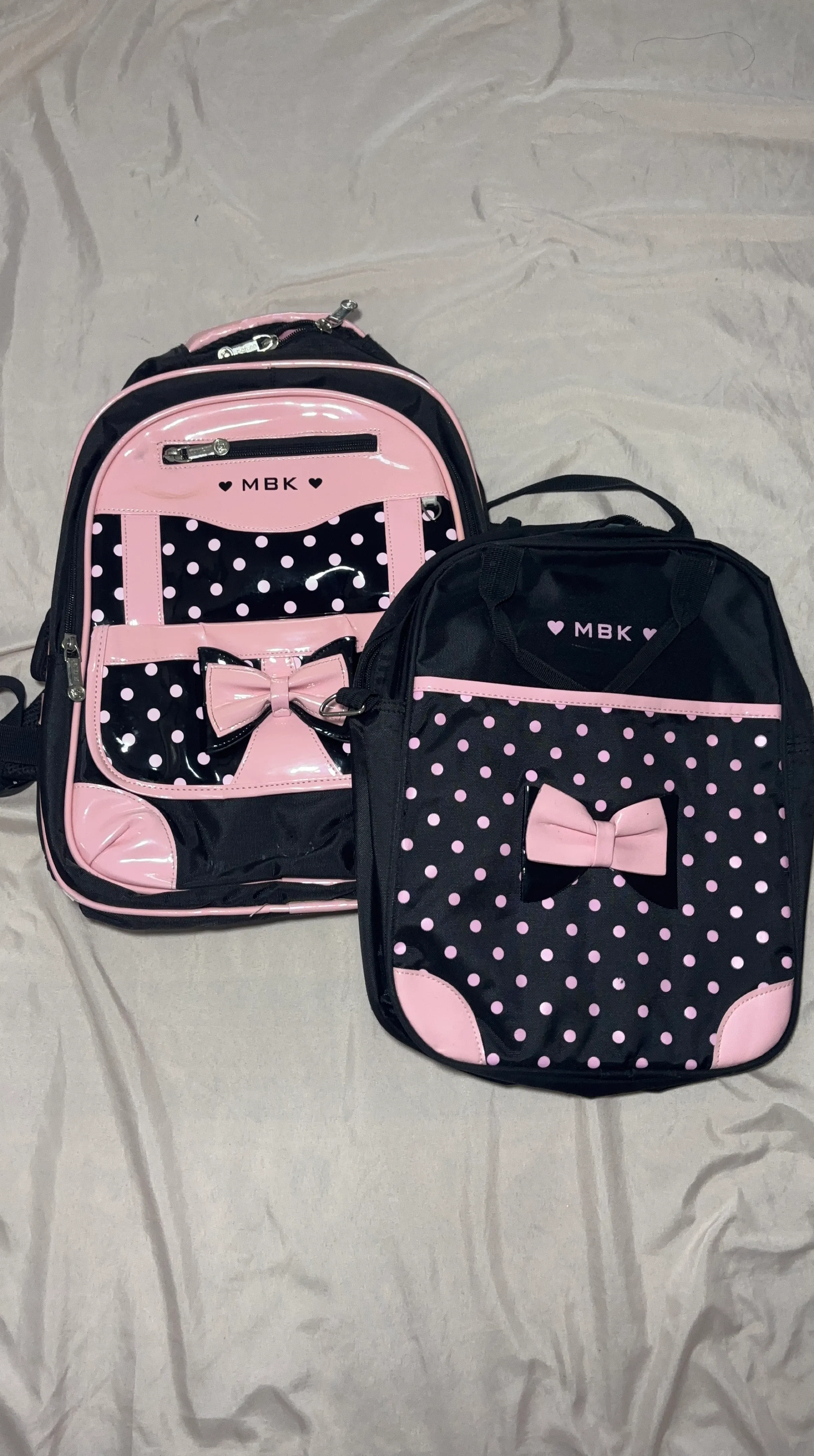 This set includes a backpack and a matching smaller bag, both featuring a black and pink polka dot design with pink bows. They're made from durable material, perfect for school or travel. This set is great for anyone who loves a fun and stylish accessory!