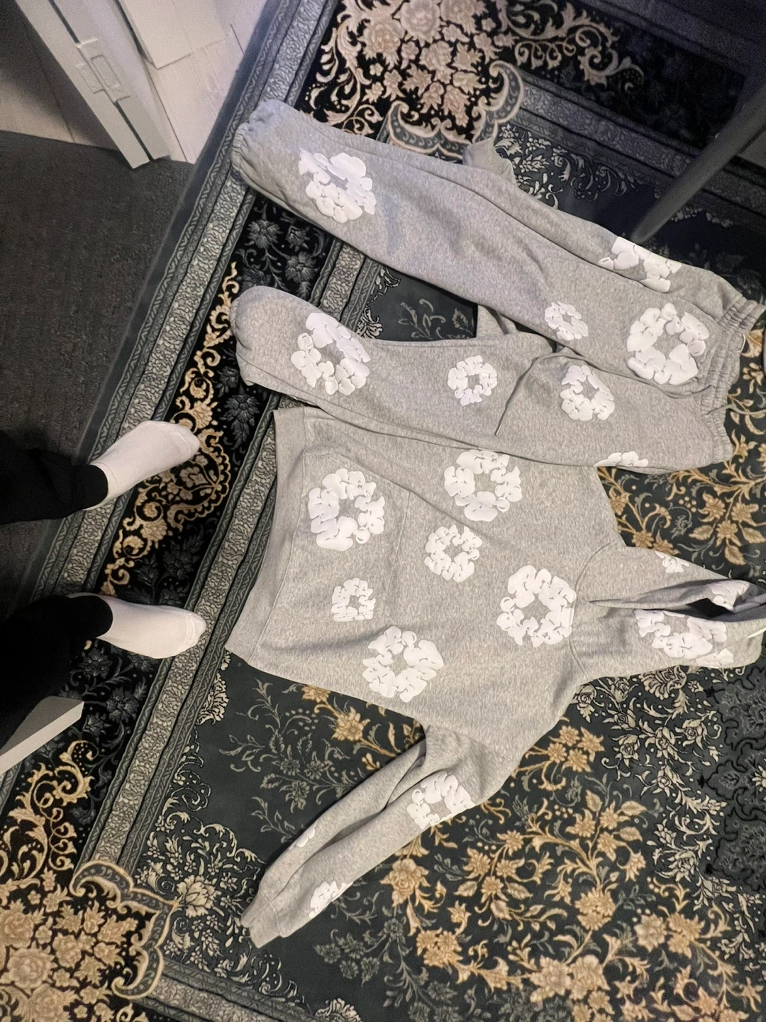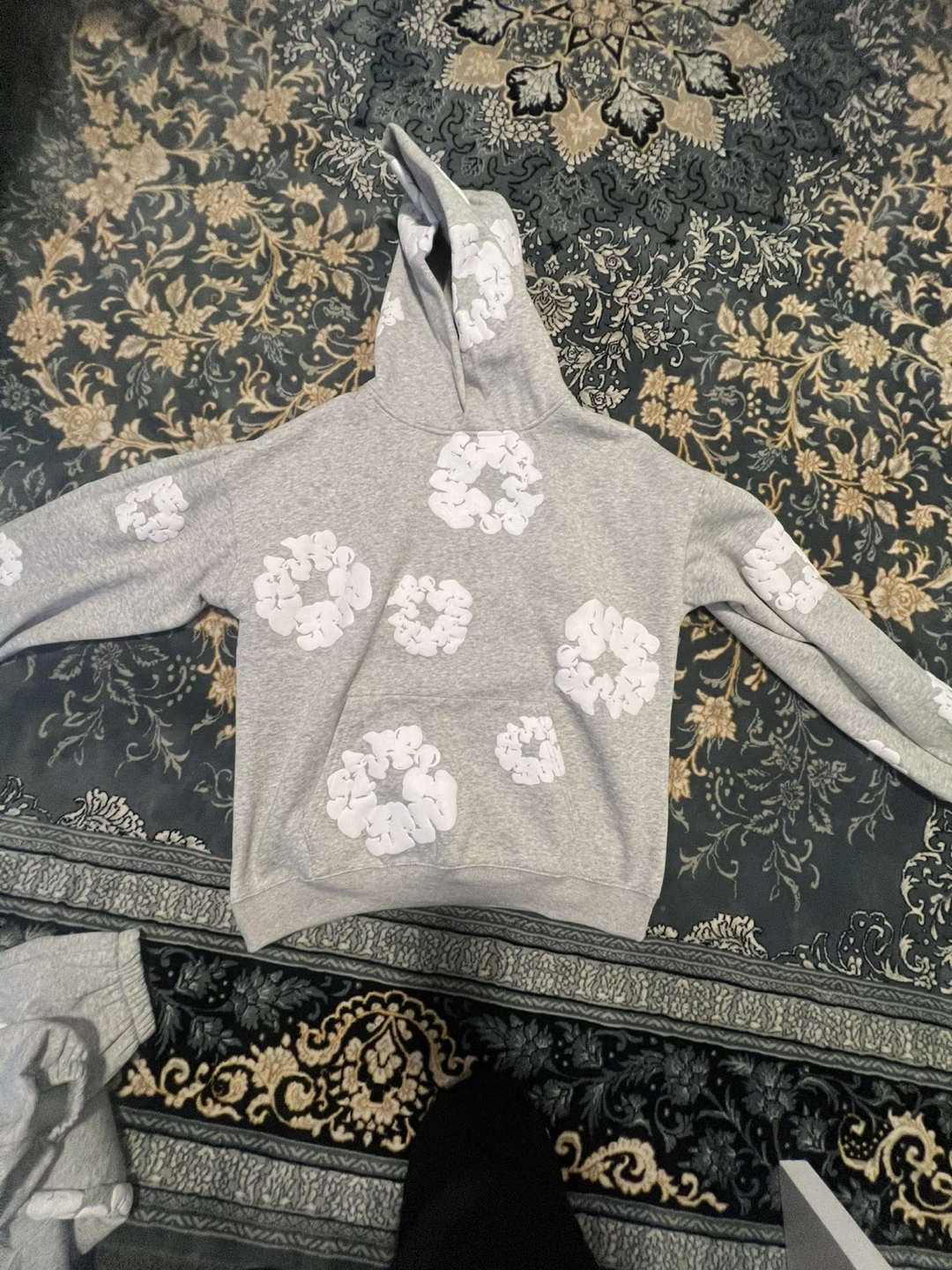 Selling a comfy grey hoodie and sweatpants set. The set has a matching design of what looks like scrunchies all over. Perfect for lounging around the house or running errands!