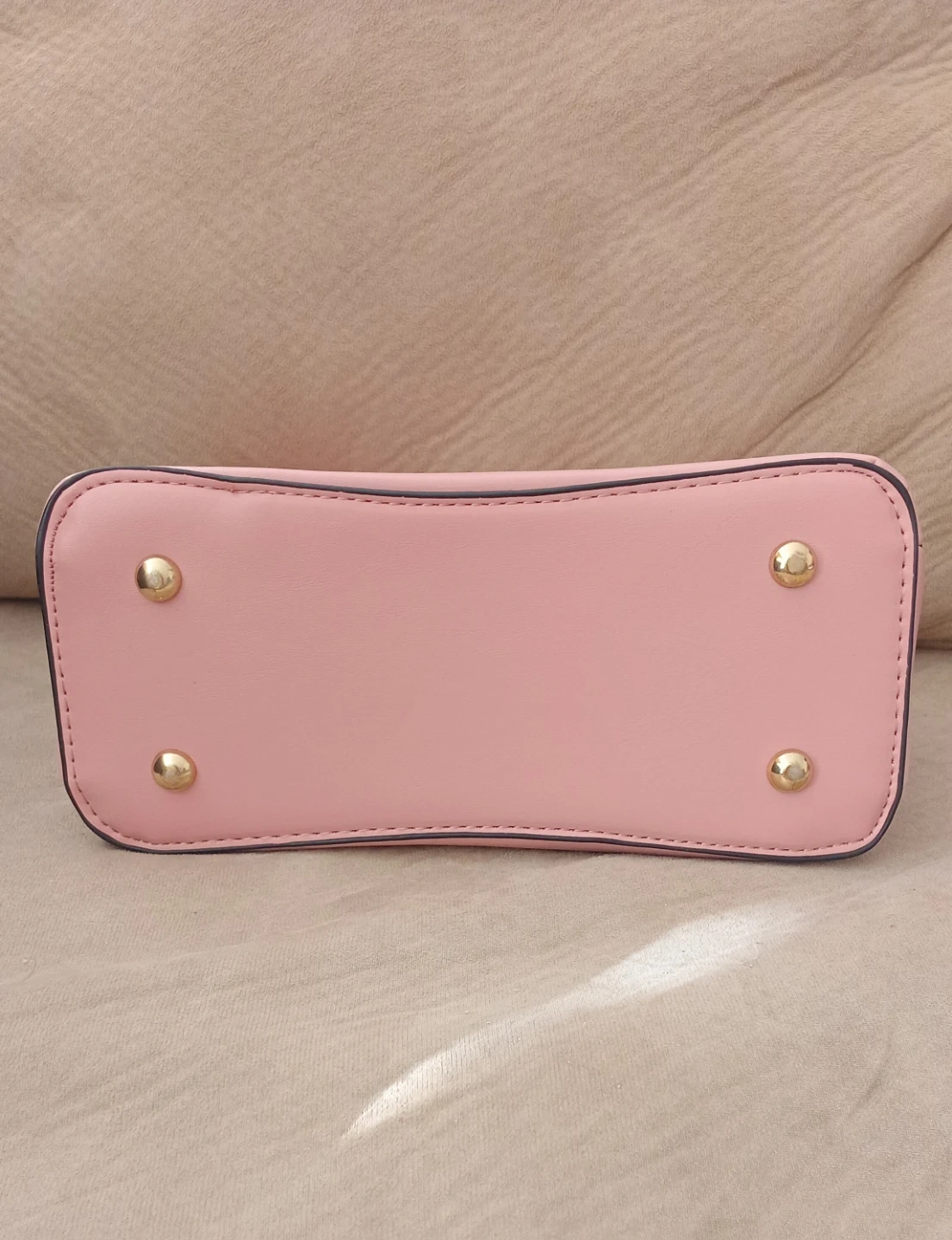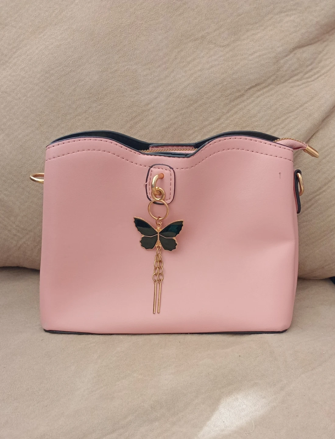 This cute pink bucket bag has a zip closure and an interior pocket. It's made from faux leather and includes a decorative butterfly charm. It's a stylish accessory for everyday use or any occasion.