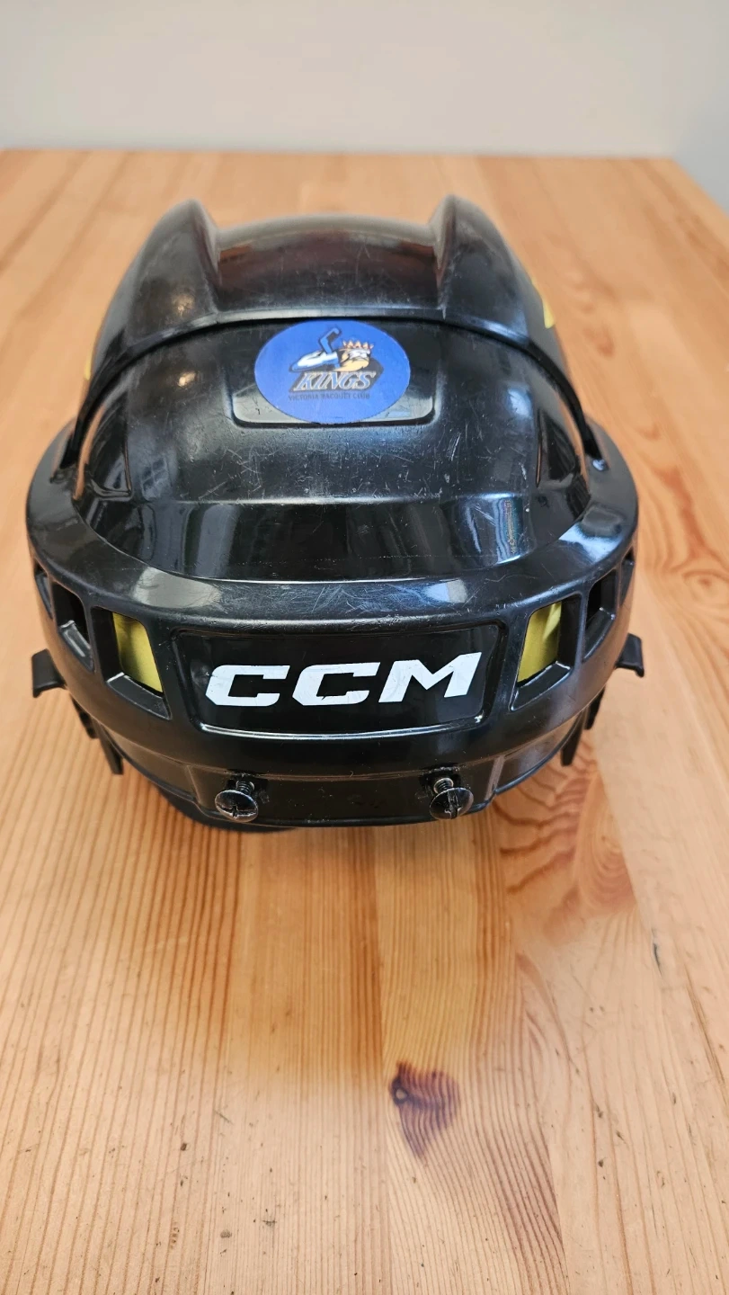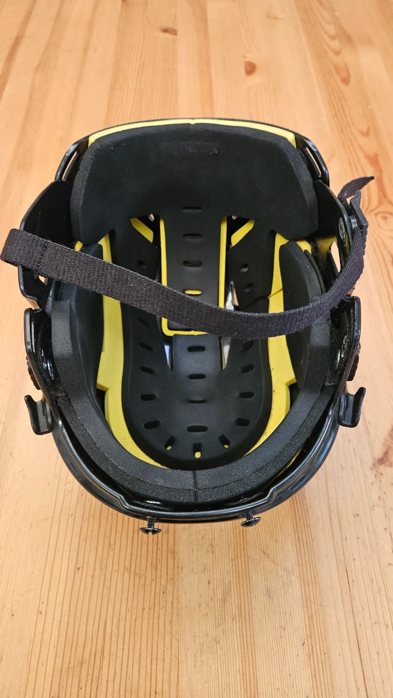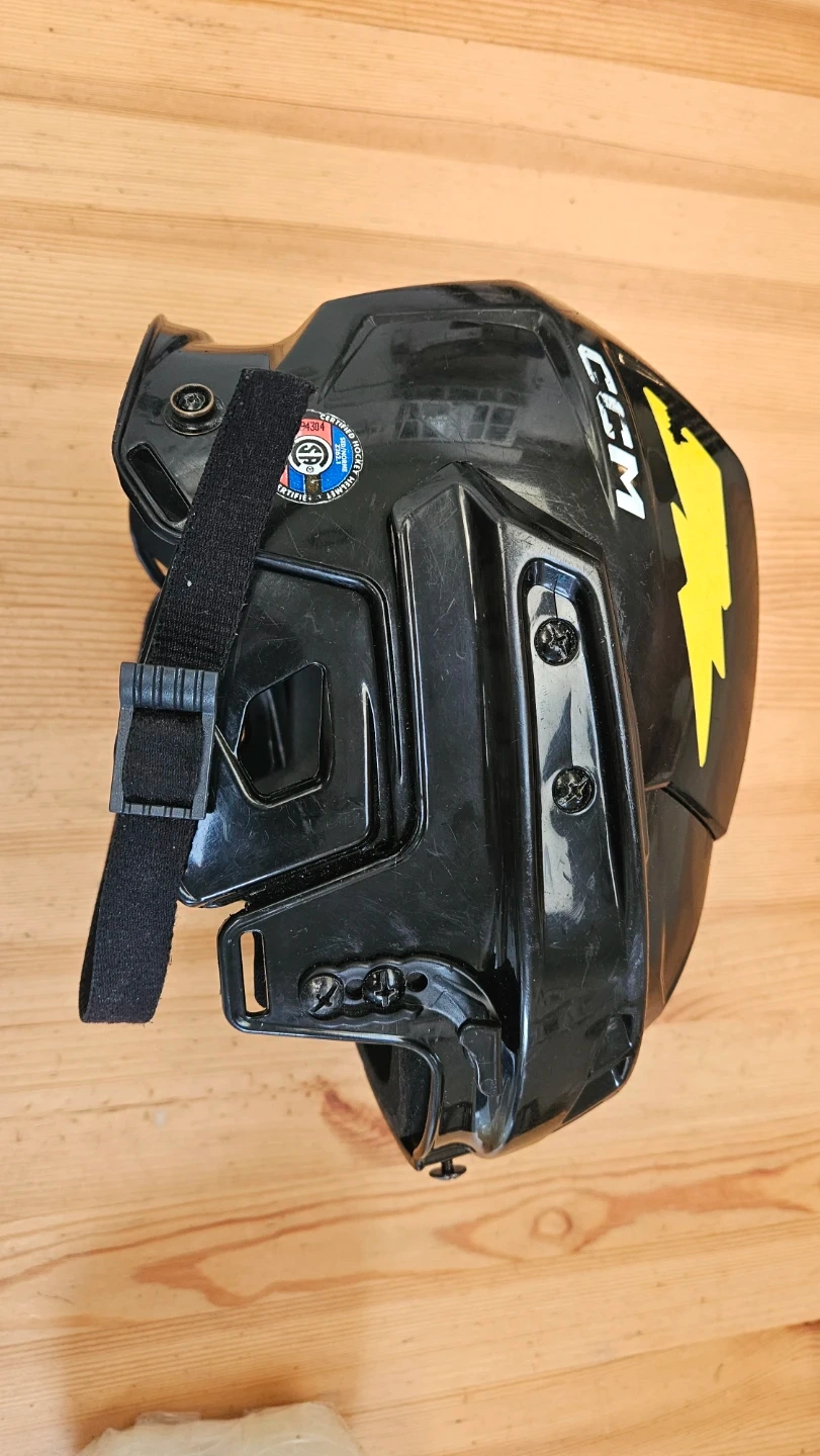 Black CCM hockey helmet with yellow interior padding. Includes chin strap. Size S.