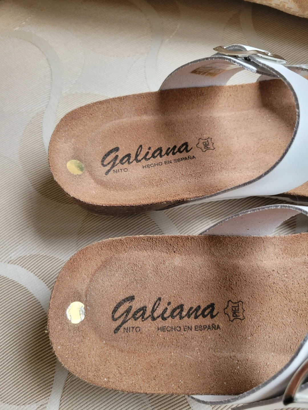 Practically New - These Galiana sandals feature a comfortable cork footbed and white leather straps with an iridescent, leopard-print accent strap. Buckle closure for an adjustable fit. Perfect for warm weather outings!