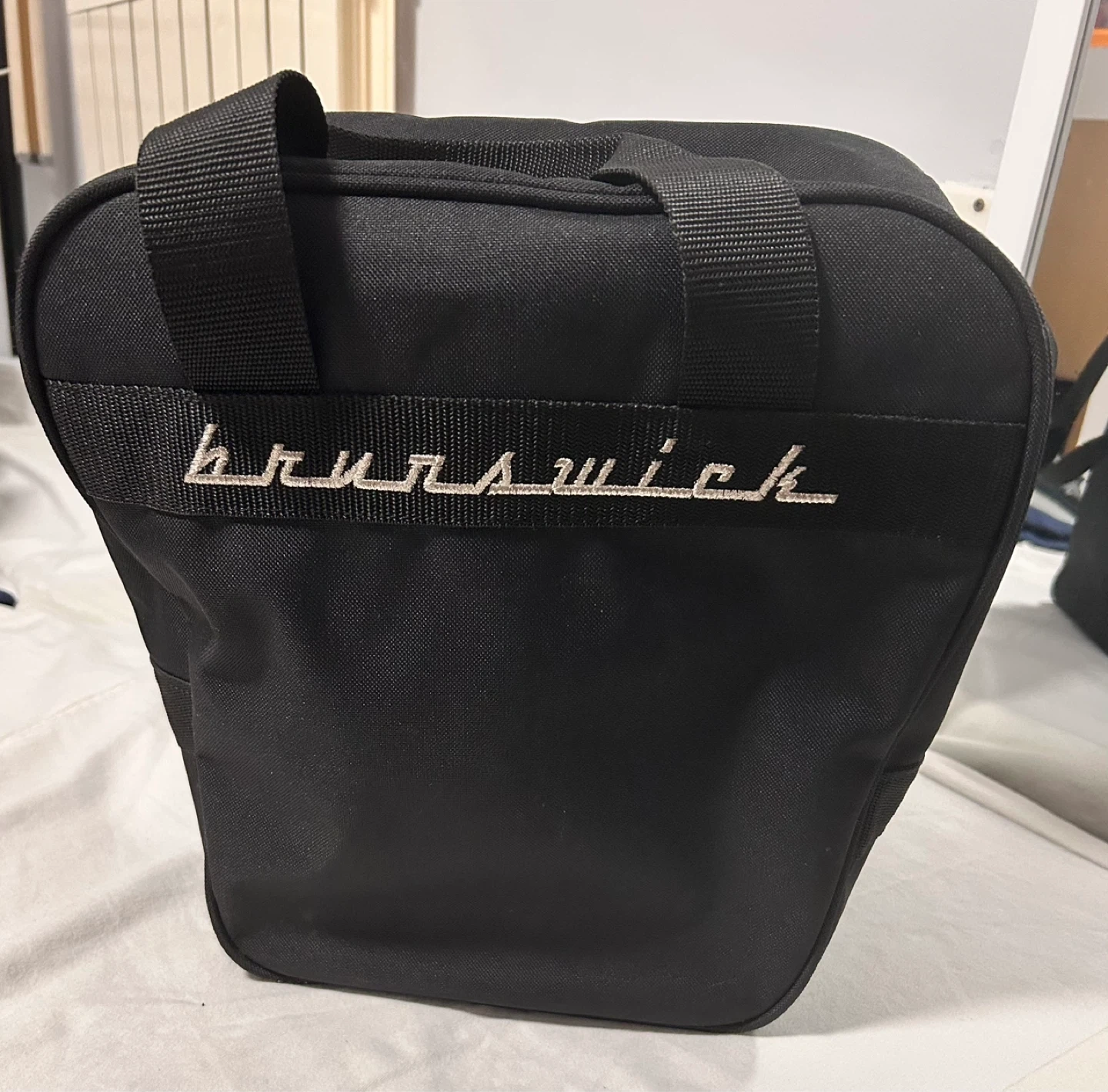 Single Carry Black Brunswick bowling ball bag. Durable nylon construction. This bag is designed to carry one bowling ball.