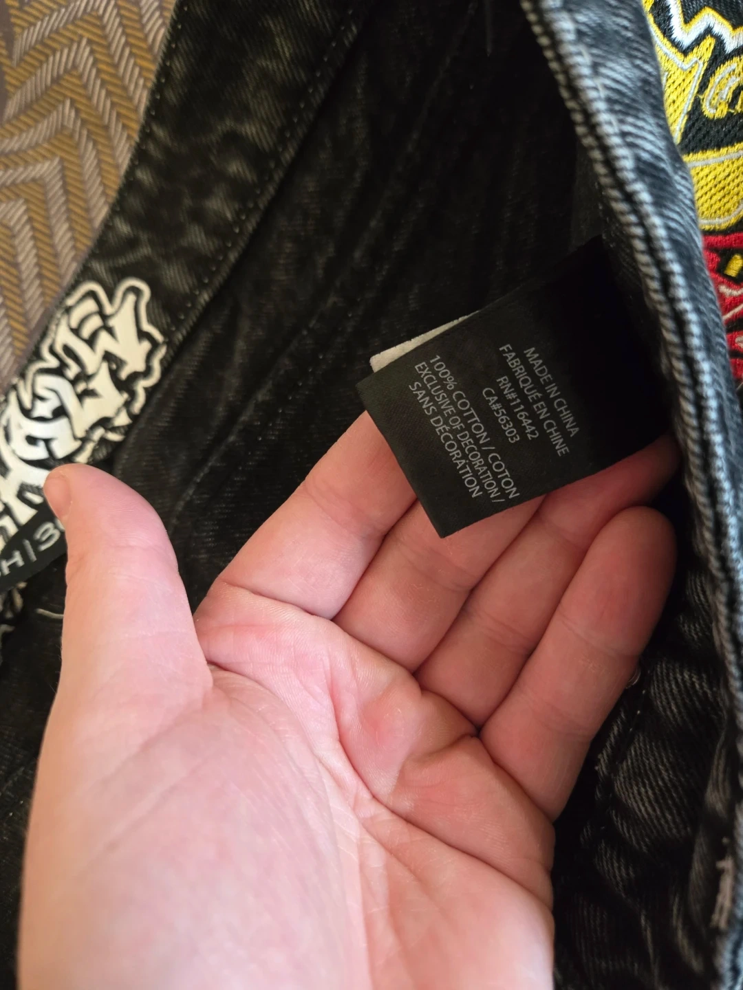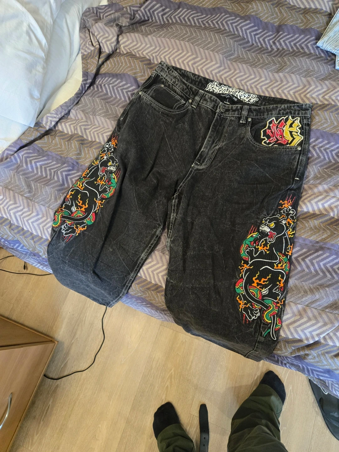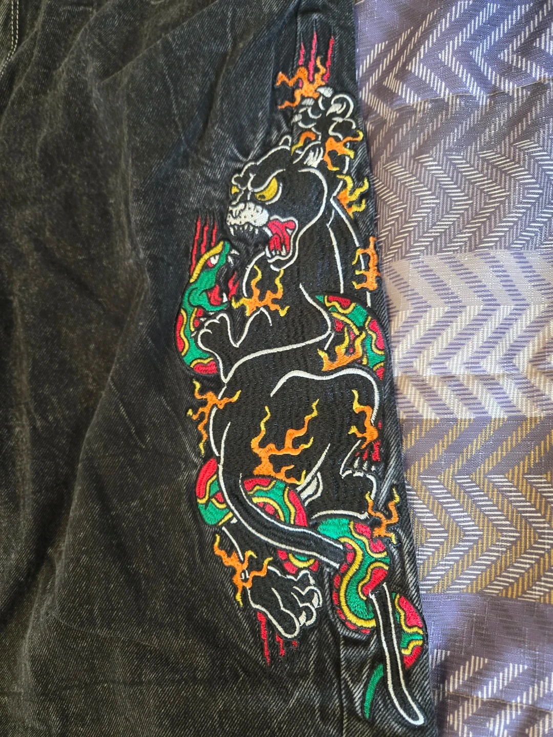 These black wash denim jeans feature bold panther and flame embroidery on the sides. They're a size 36. Made from 100% cotton.