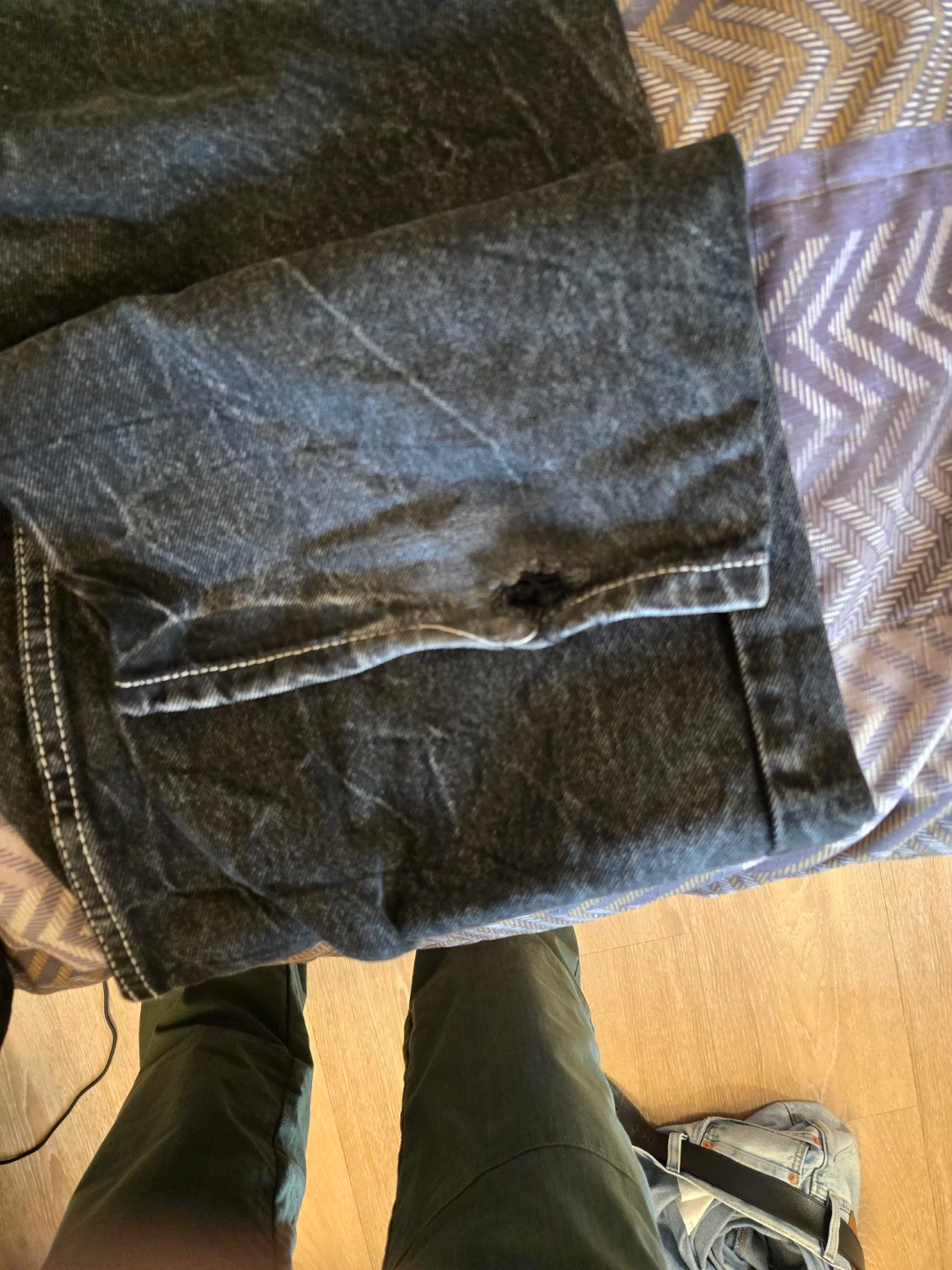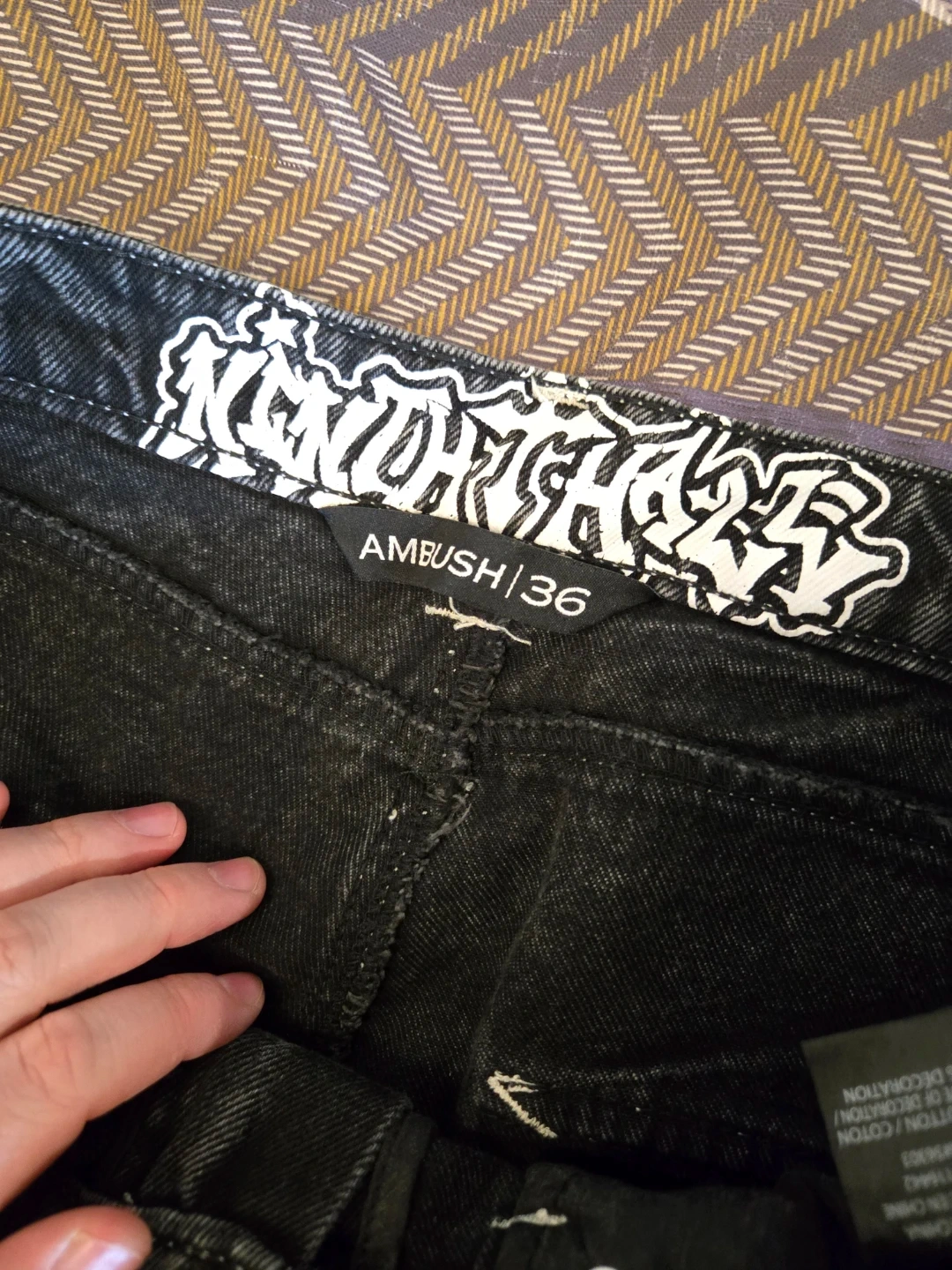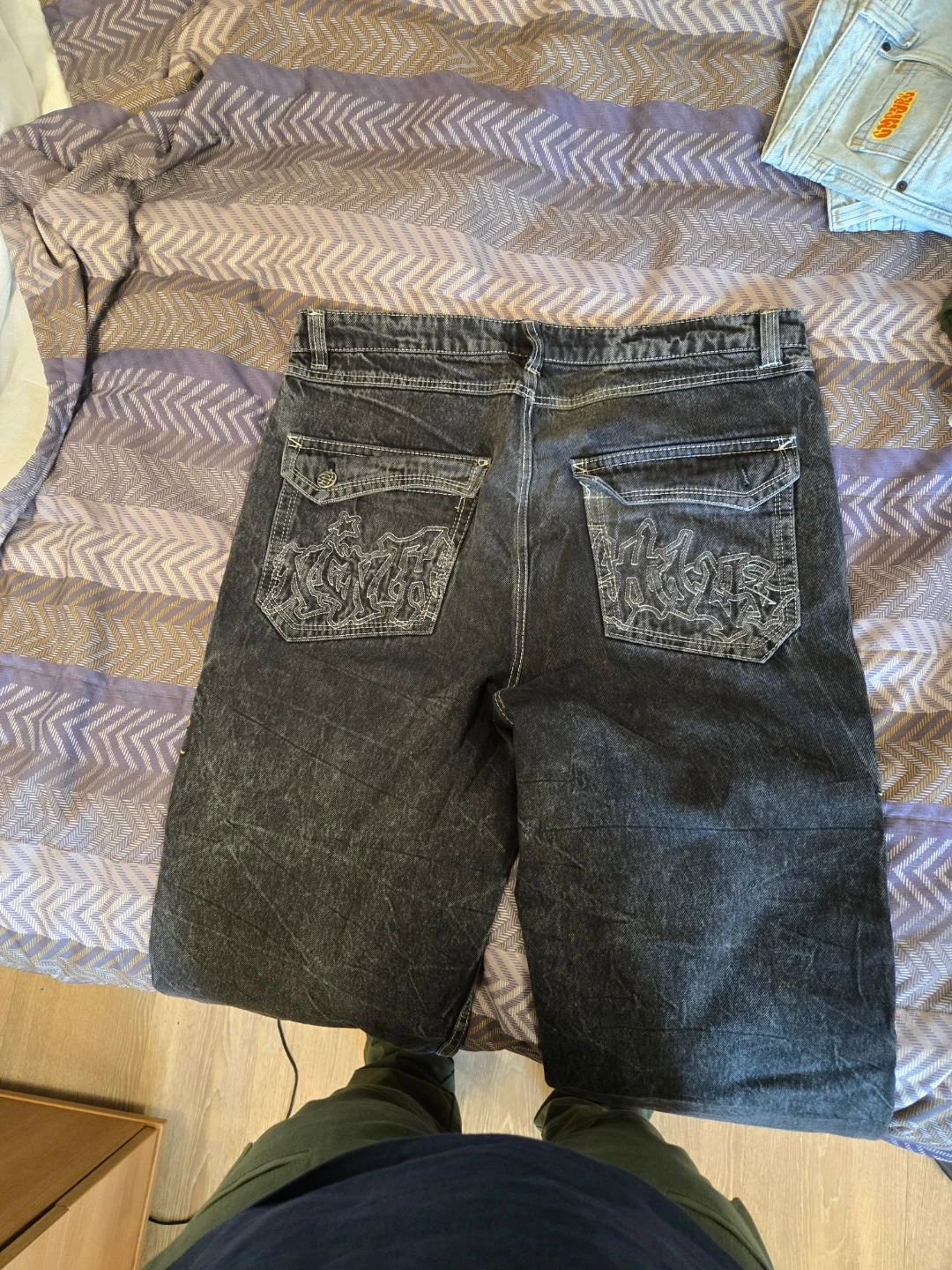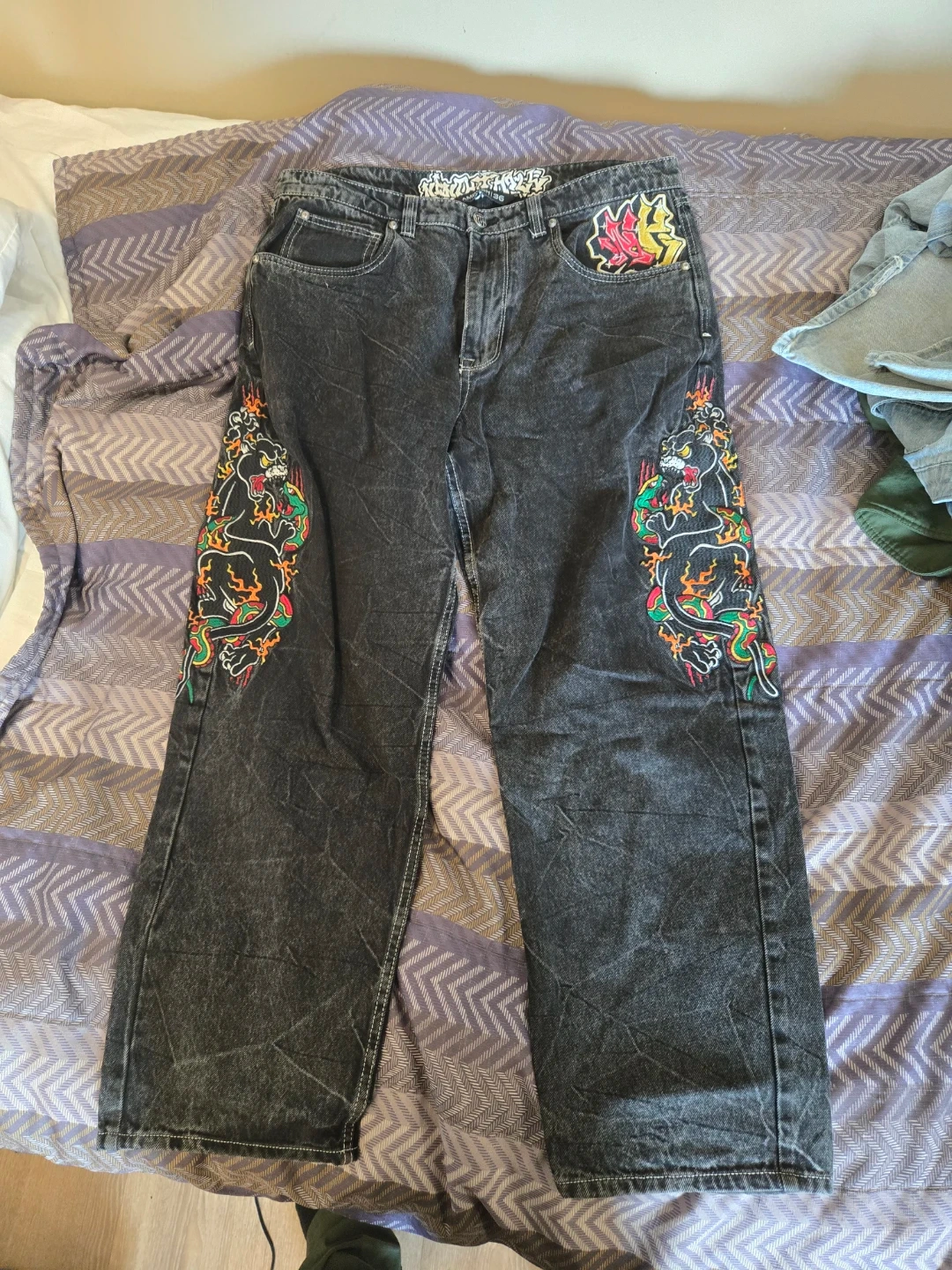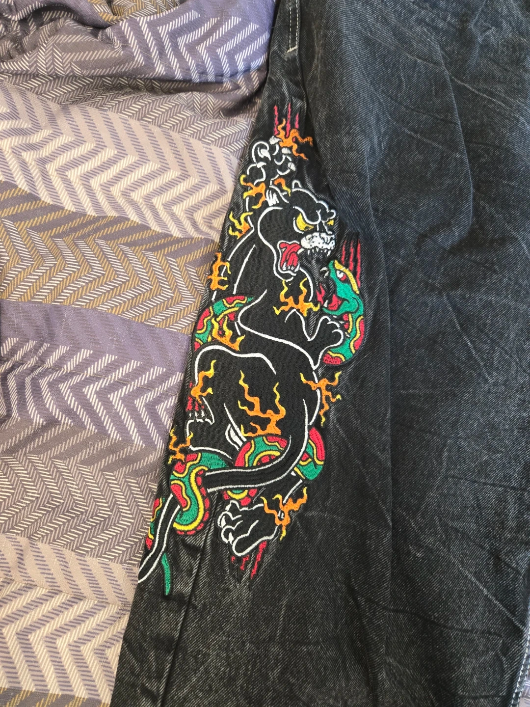 These black wash denim jeans feature bold panther and flame embroidery on the sides. They're a size 36. Made from 100% cotton.
