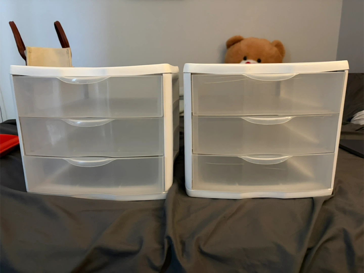 This is a white 3-drawer storage organizer. It's made of plastic with clear drawers. It's great for small items, art supplies, or desk organization.