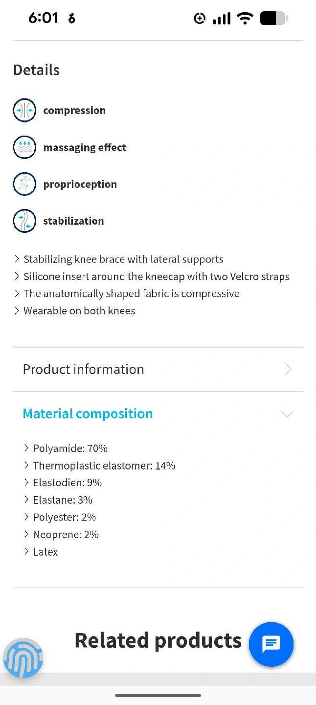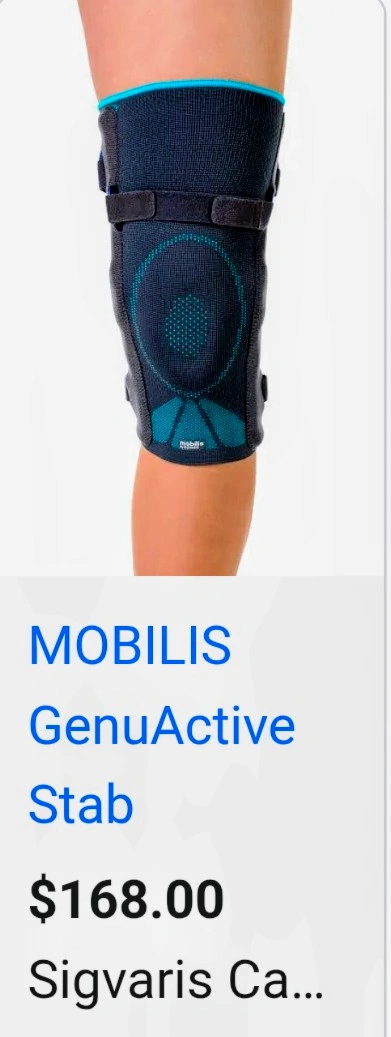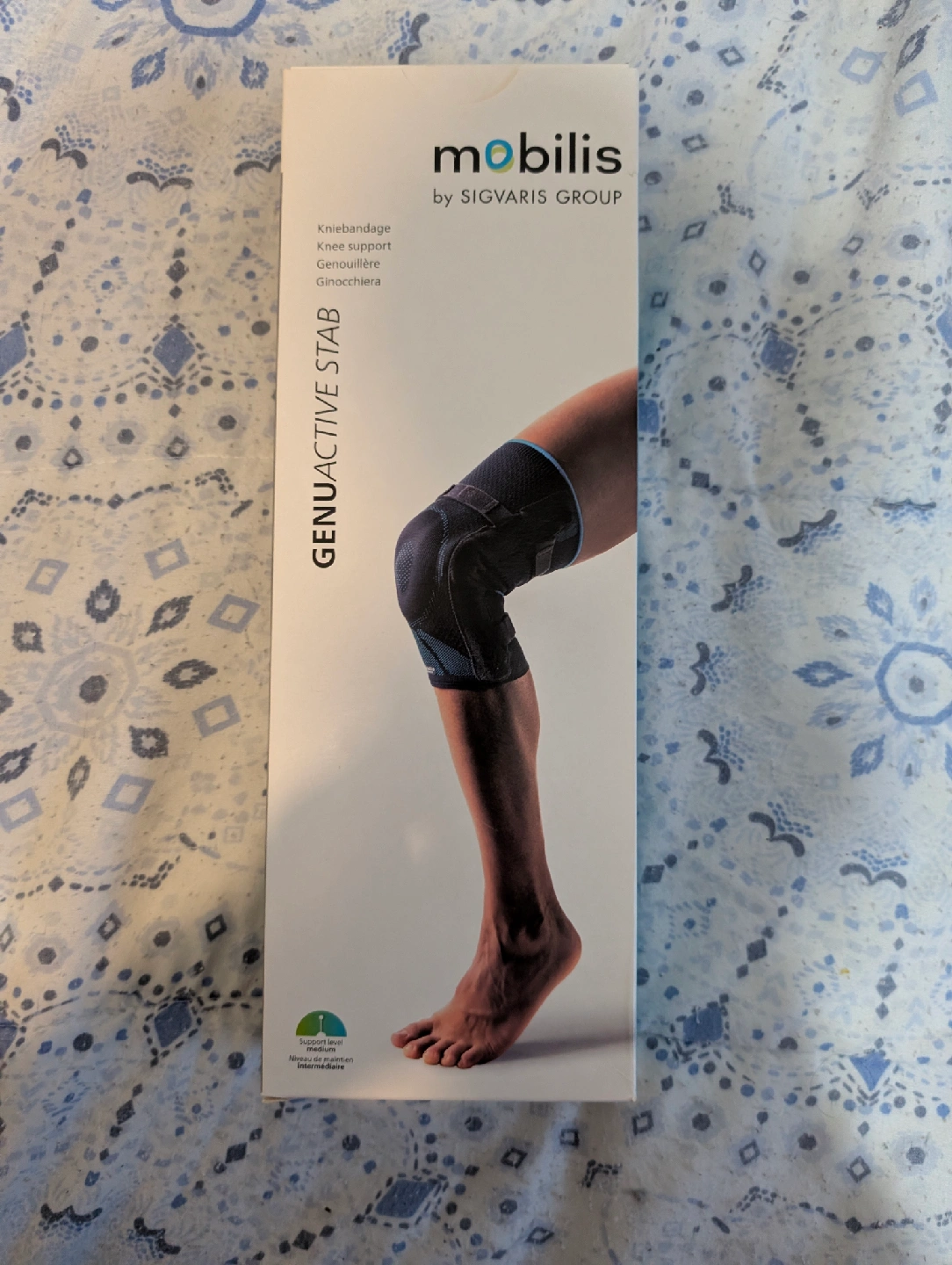 23Selling a Mobilis GenuActive Stab knee brace. It offers compression, a massaging effect, proprioception, and stabilization. It features a stabilizing knee brace with lateral supports and a silicone insert around the kneecap with two Velcro straps. The fabric is anatomically shaped and compressive, and it's wearable on both knees. Material composition: - 70% polyamide - 14% thermoplastic elastomer - 9% elastodien - 3% elastane - 2% polyester - 2% neoprene - latex