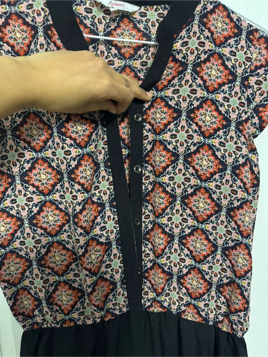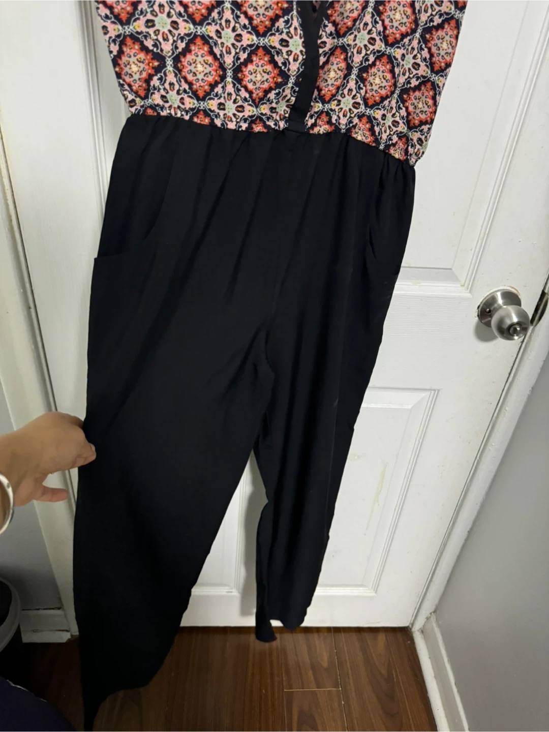Cute Rouge Heart jumpsuit in size medium! It features a unique patterned top and solid black bottoms. Perfect for a casual outing or dressing up for a special occasion