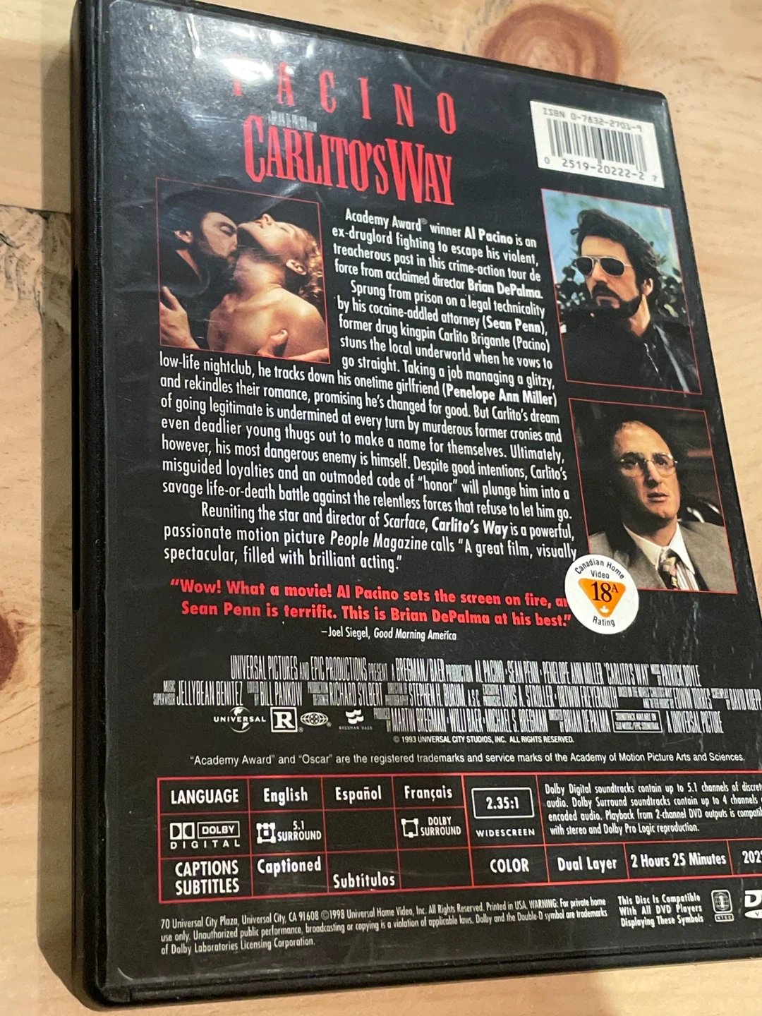 This is the DVD for the movie Carlito's Way. It's a widescreen edition but it is one of the original releases so it’s not anamorphic. (Won’t stretch to fit a widescreen TV)