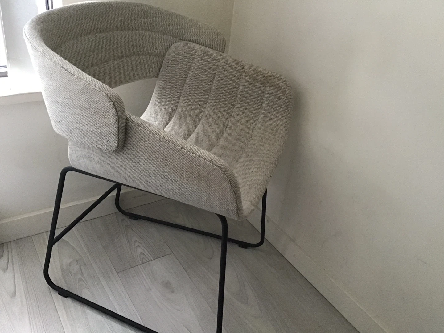 28This is a stylish armchair that would look great in any room. It features a comfortable, textured seat and backrest in a neutral color, complemented by sleek black metal legs. The chair is in good condition and ready for a new home