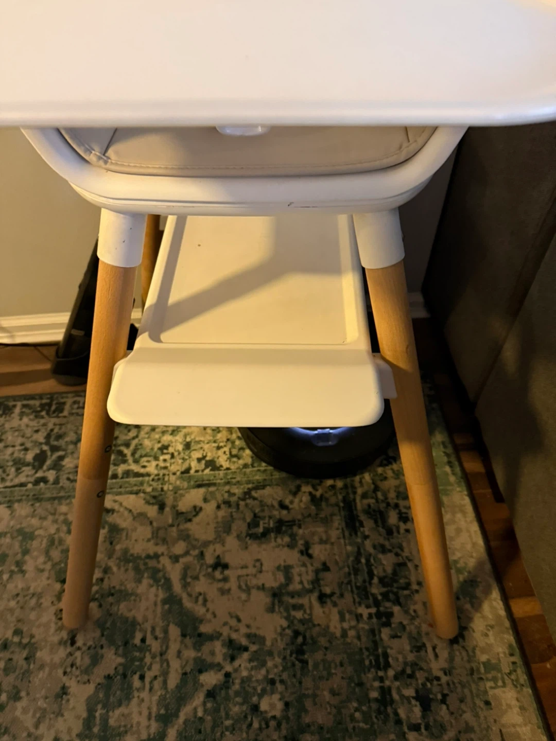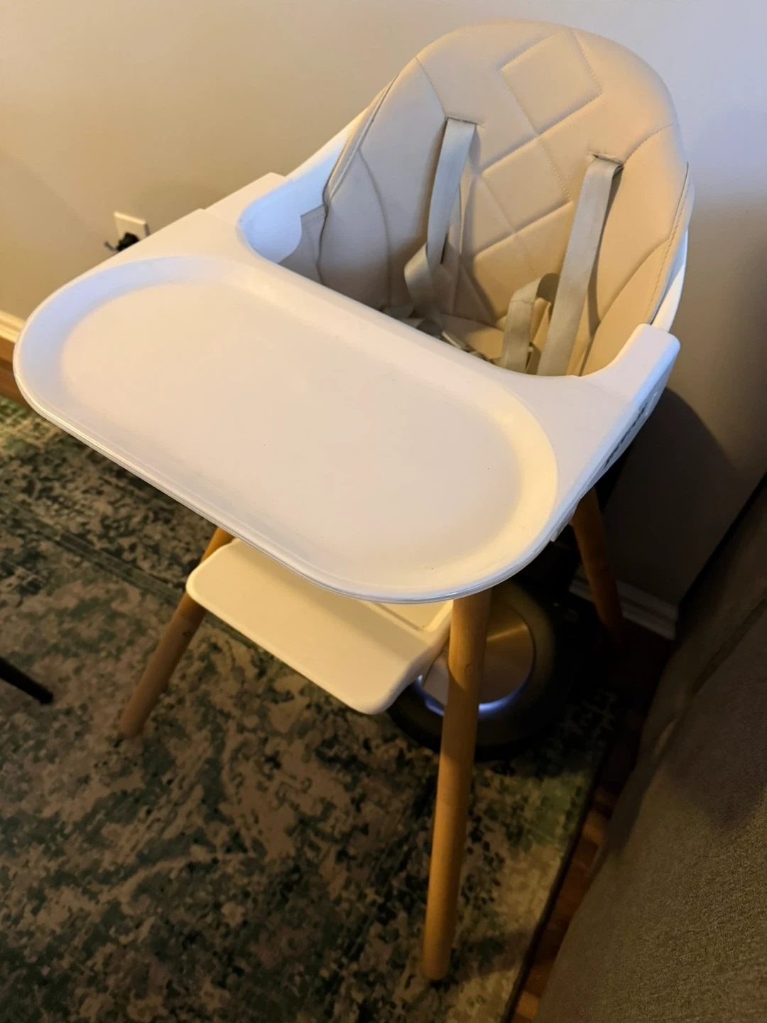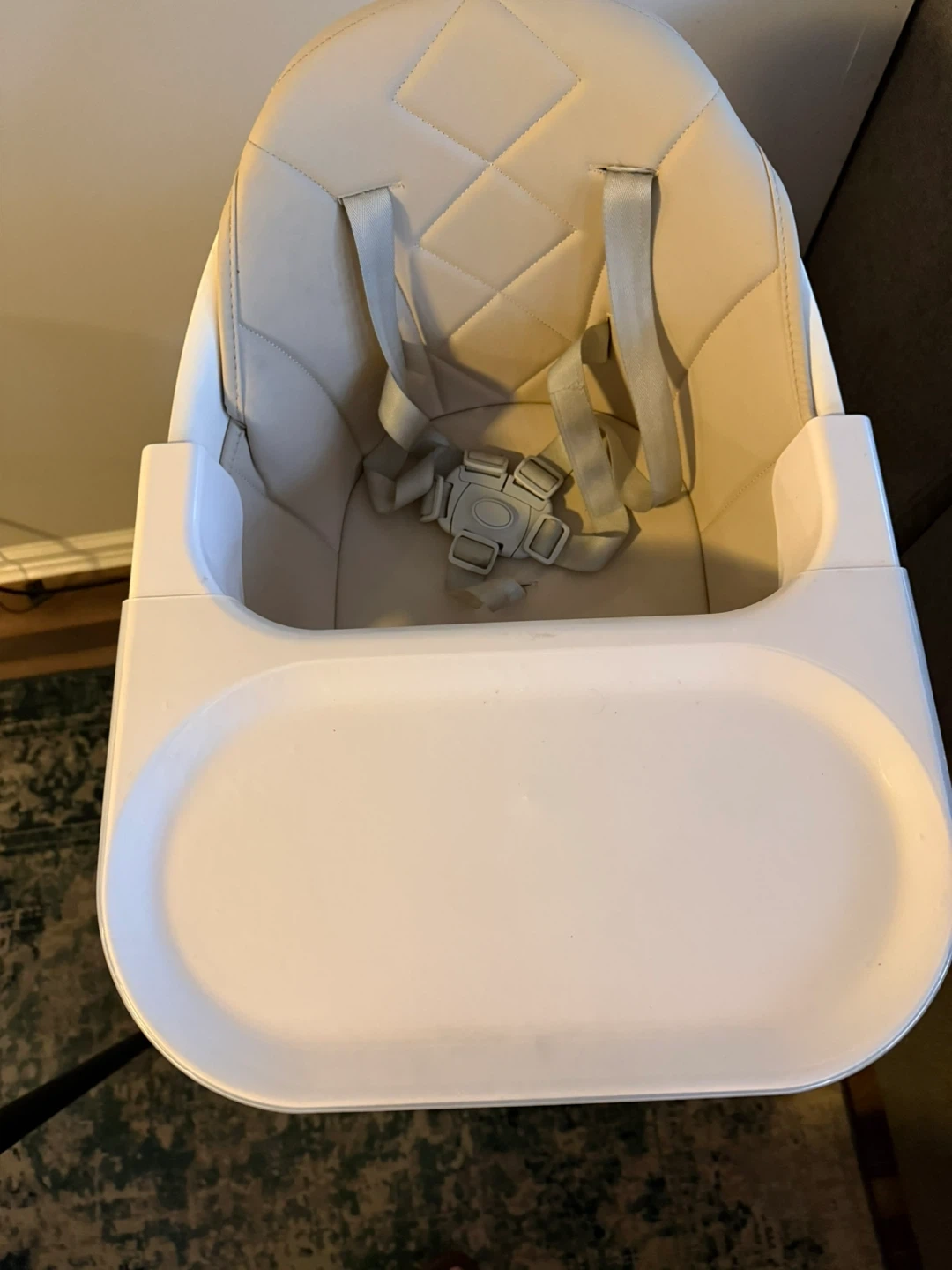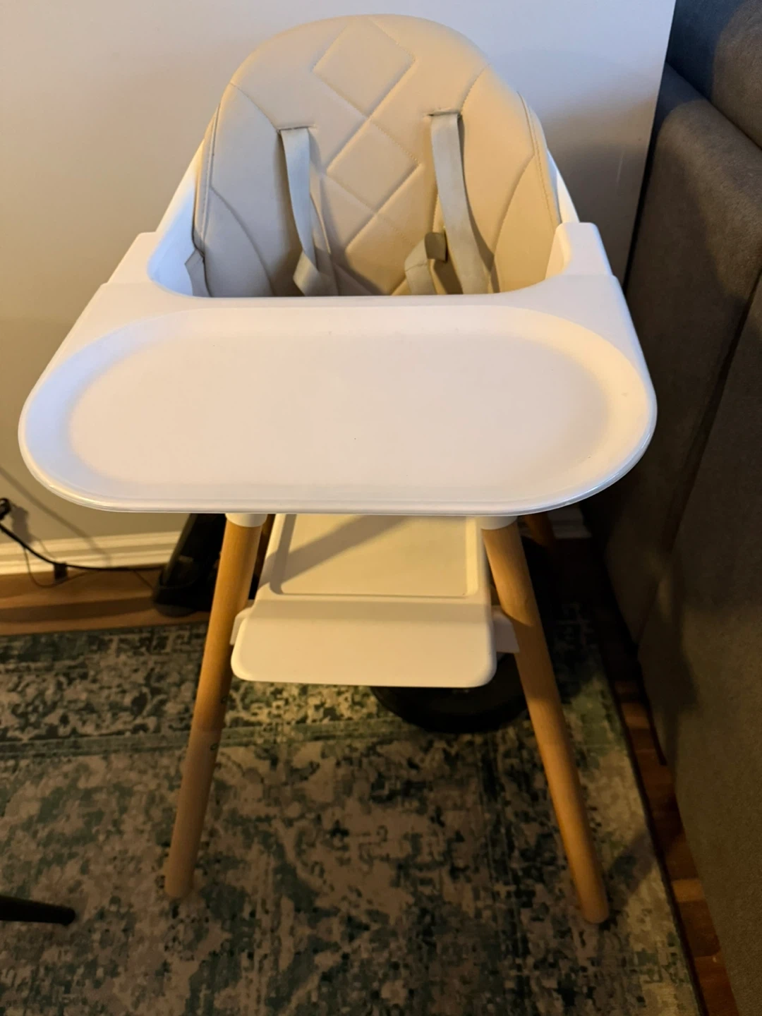 5Selling a modern baby high chair in great condition! It features a white seat and tray with wooden legs. The seat has a cream-coloured cushion and safety straps. Perfect for meal times!