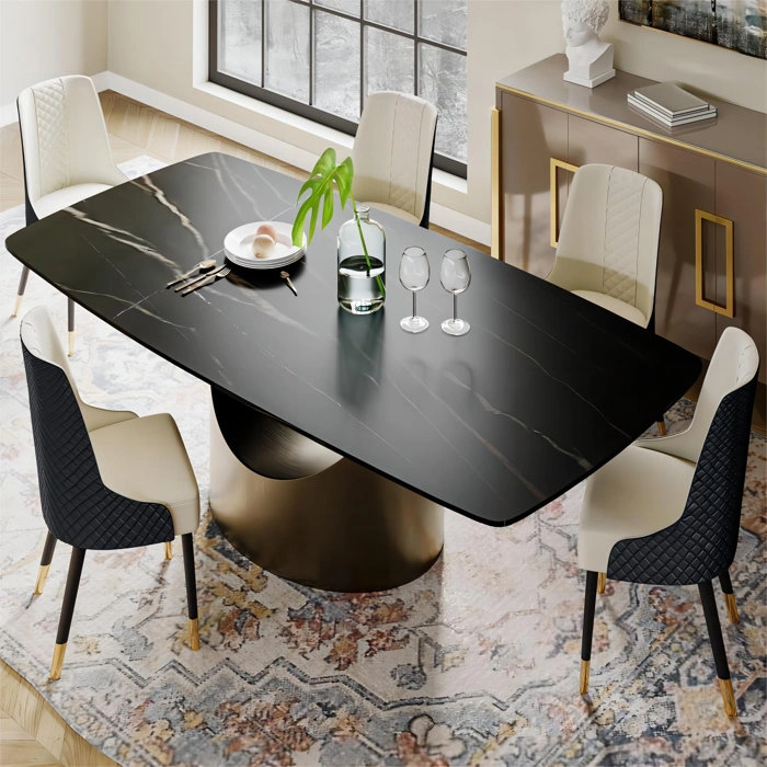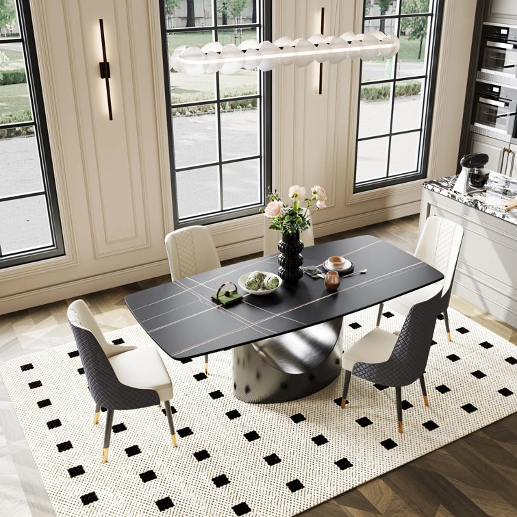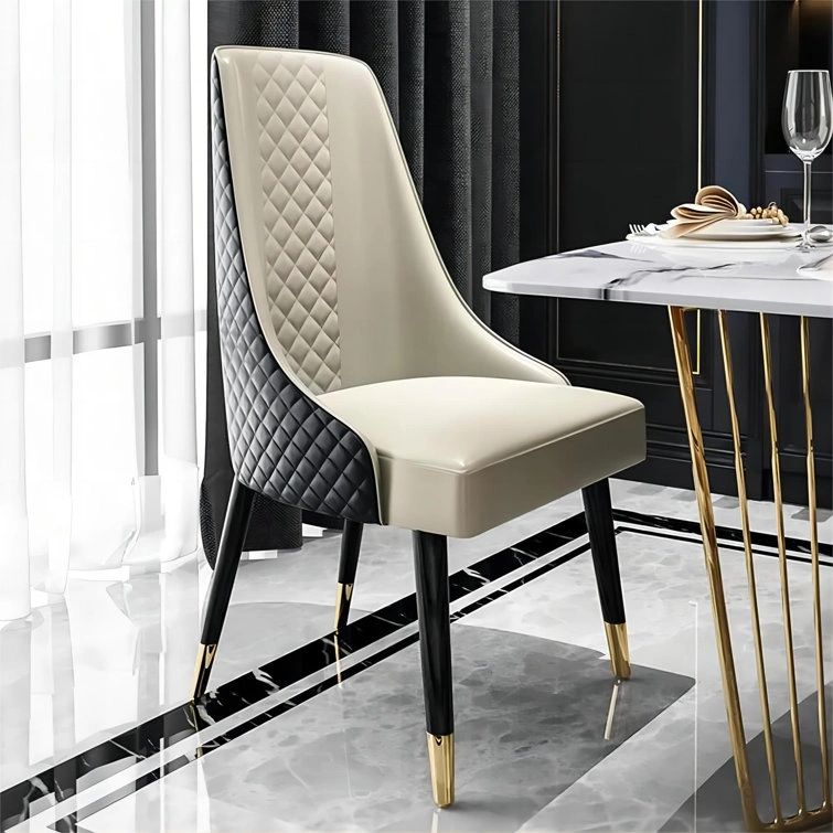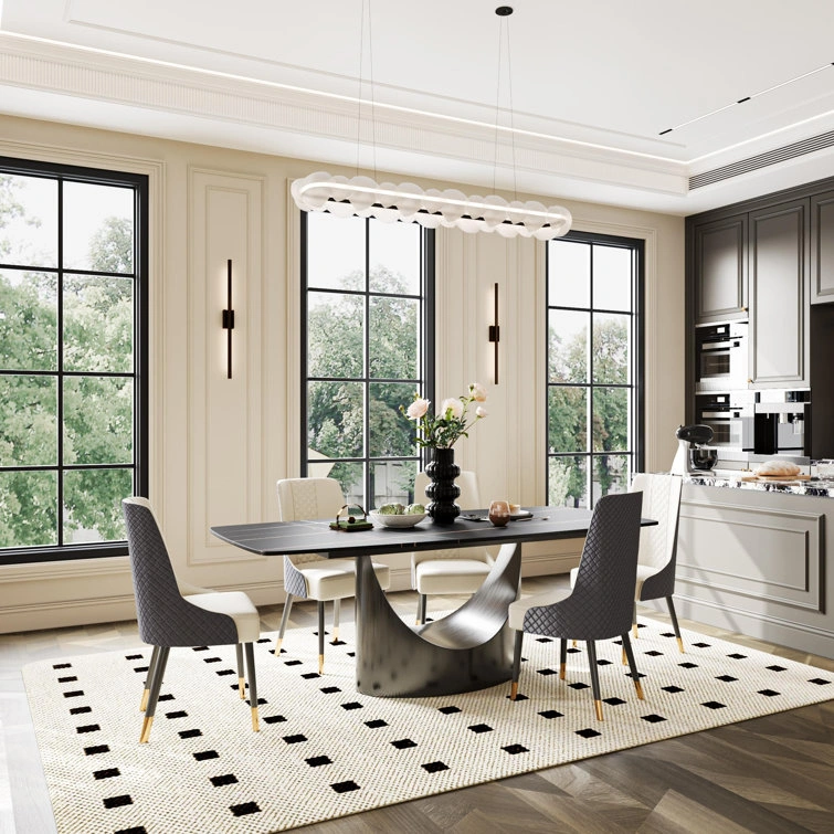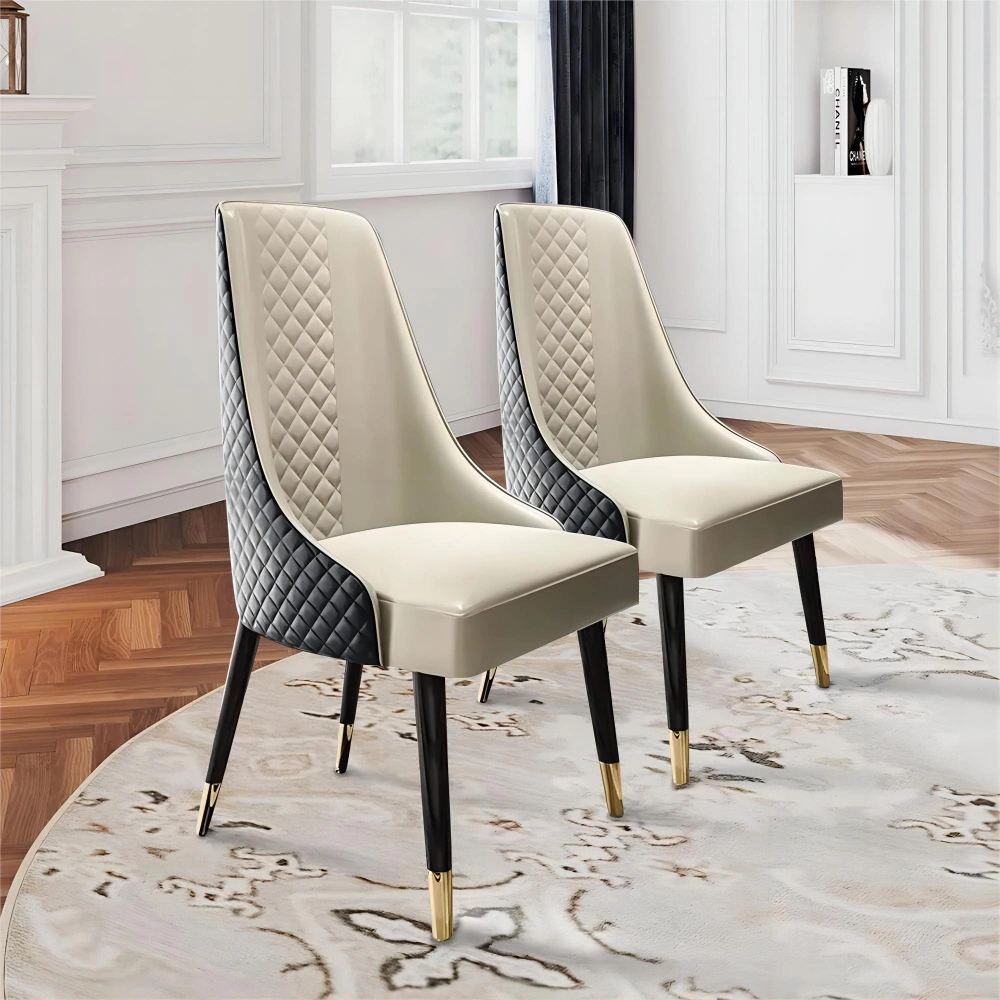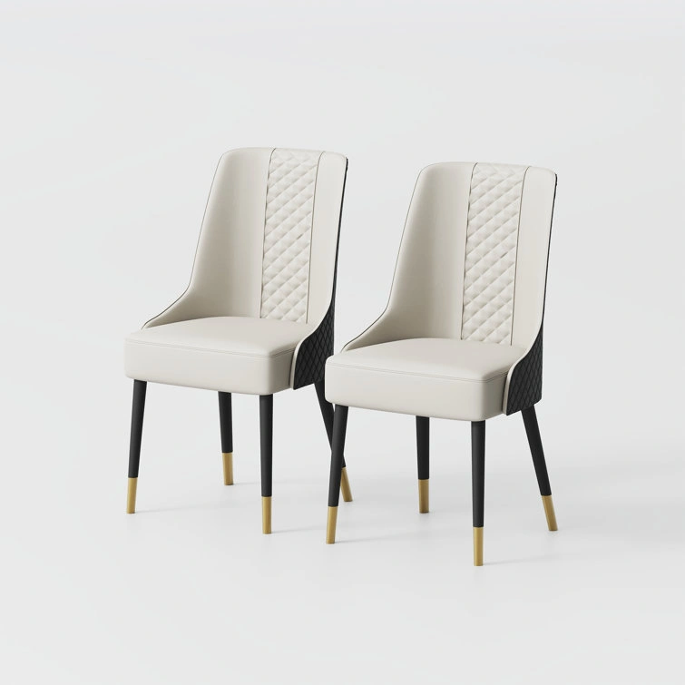 Elegant dining set. Features a black marble table top and gold-toned base. two upholstered chairs included, off-white and black. Stylish and contemporary design. Perfect for a modern home.