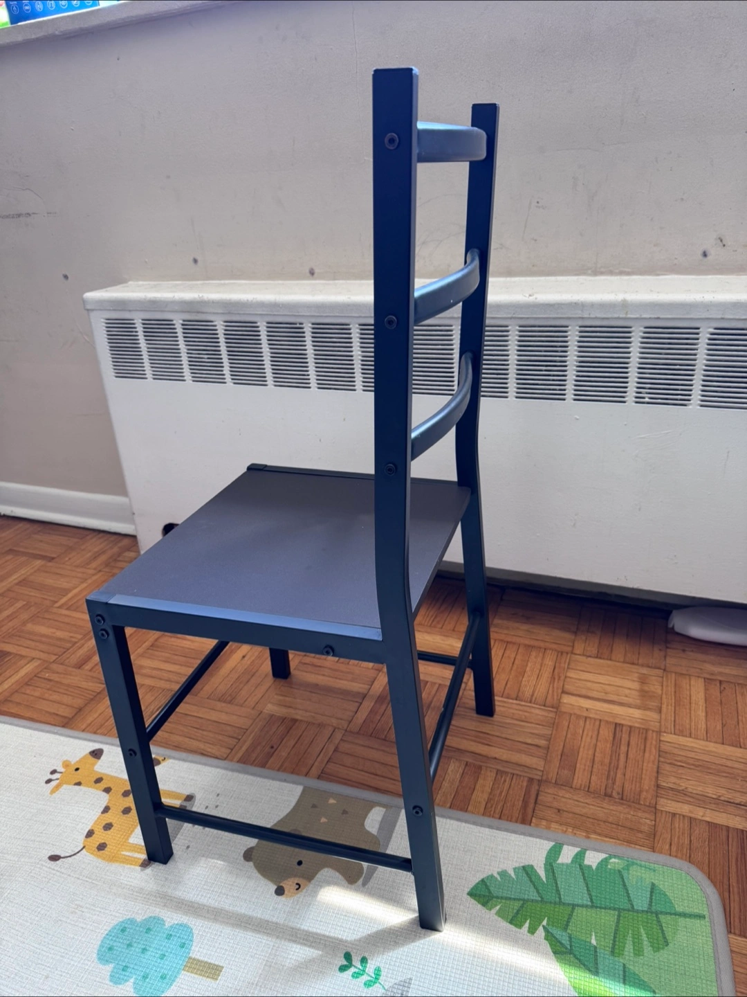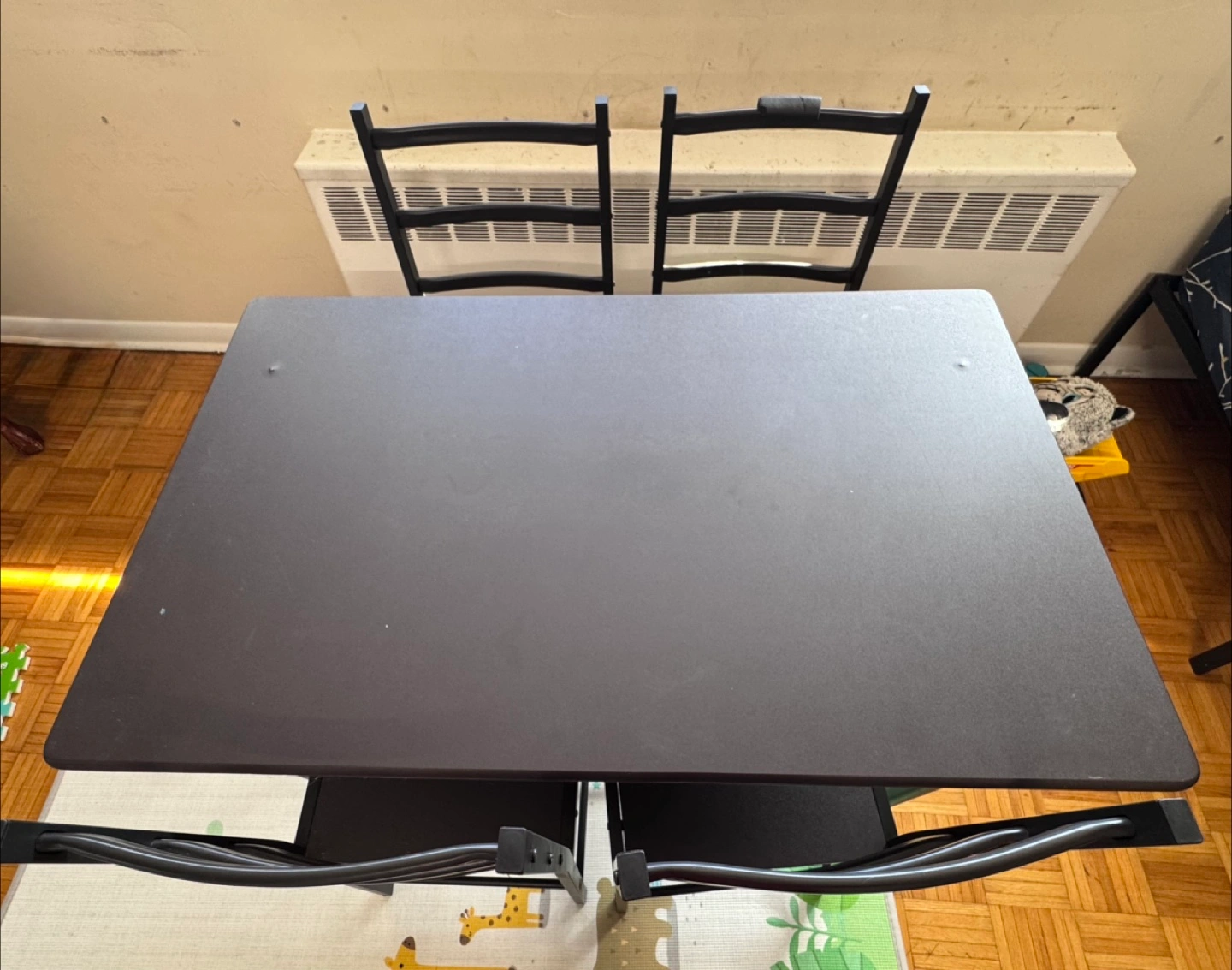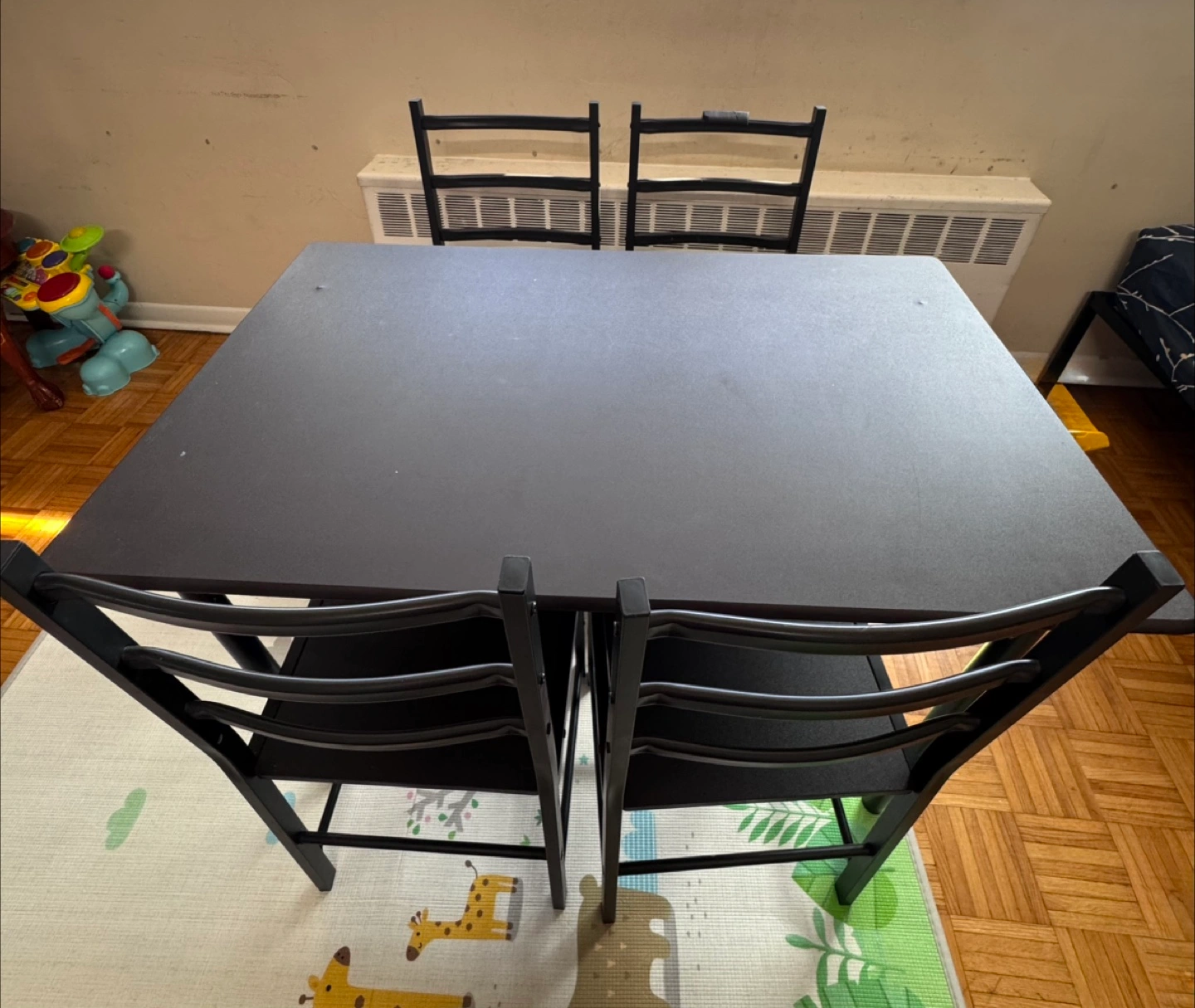 A modern table with matching chairs. Chairs have a ladder-style back. Table has a dark surface. Table legs are dark. Seating is simple and clean. This table and chairs are perfect for small spaces or for sharing a quiet meal with a friend.