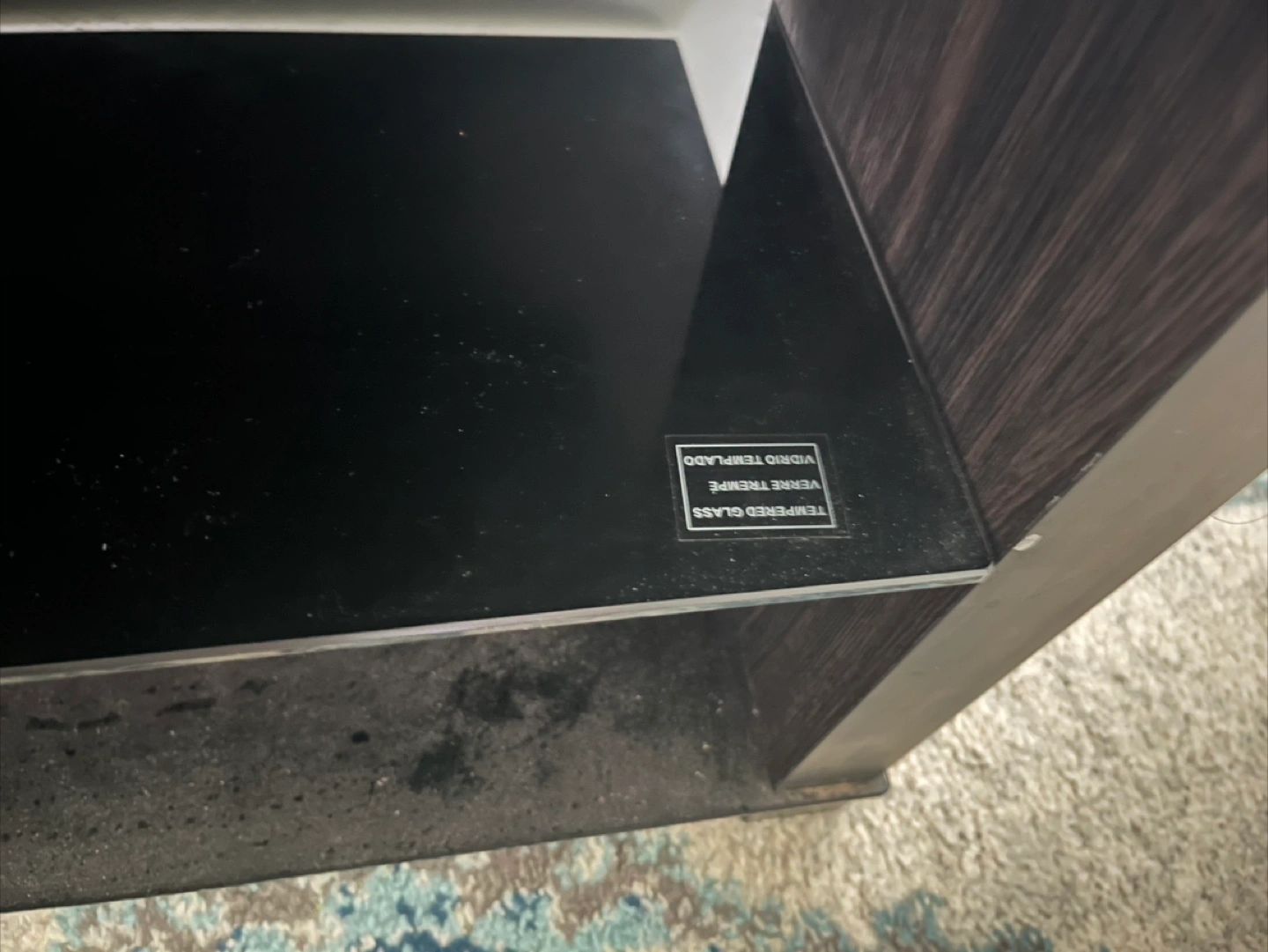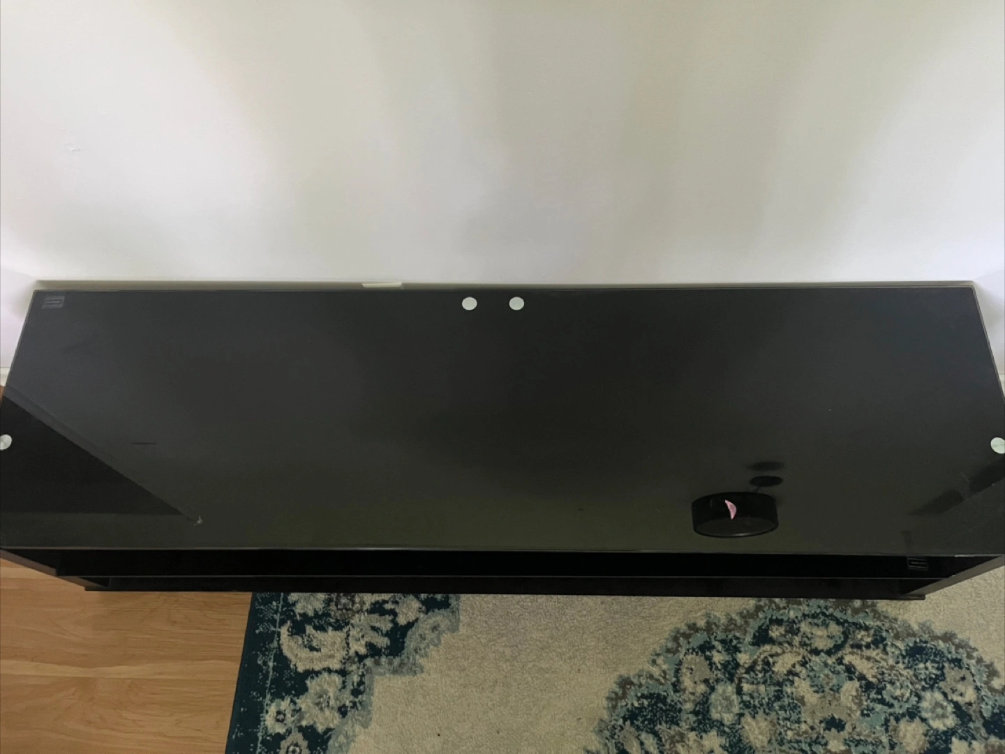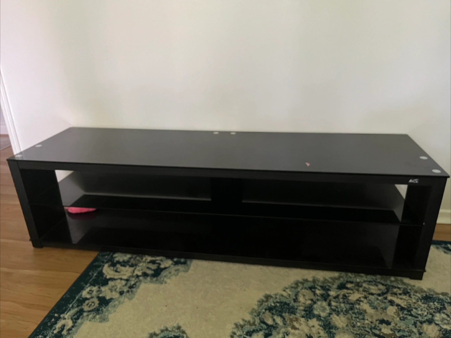 Stylish TV stand, a versatile piece for any living room. Features multiple shelves, providing storage for electronics. A calming space for your entertainment needs. It has a sleek, minimalist design. tampered glass Metal