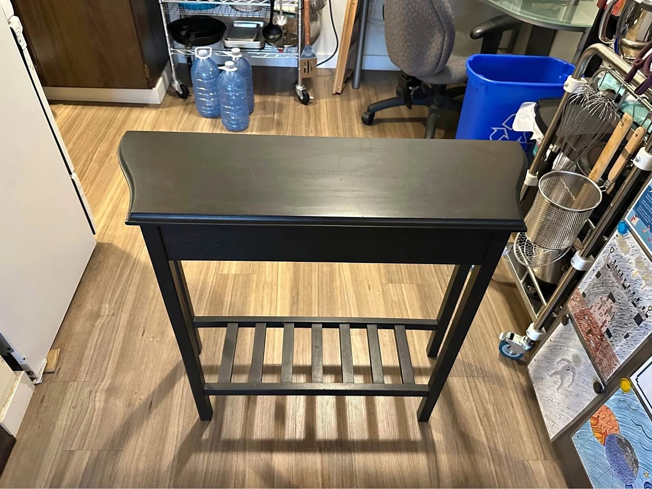 15Payed $99.99 for it at home sense, in excellent condition. Add style and functionality to any room with this sleek black wall table. Perfect for entryways, living rooms, or offices, it features a sturdy tabletop ideal for décor, keys, or everyday items. The lower storage rack provides convenient extra space for baskets, shoes, or books — keeping your area organized and clutter-free. • Sturdy and stable design • Matte black finish suits any décor • Compact and space-saving • Great for entryways, hallways, or small apartments Dimensions: W 32” H 29.5” D 10.5”