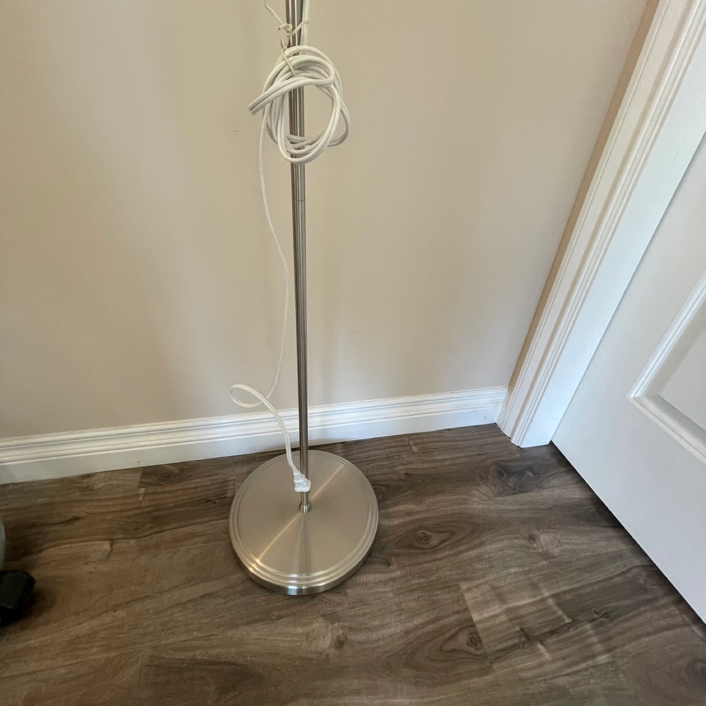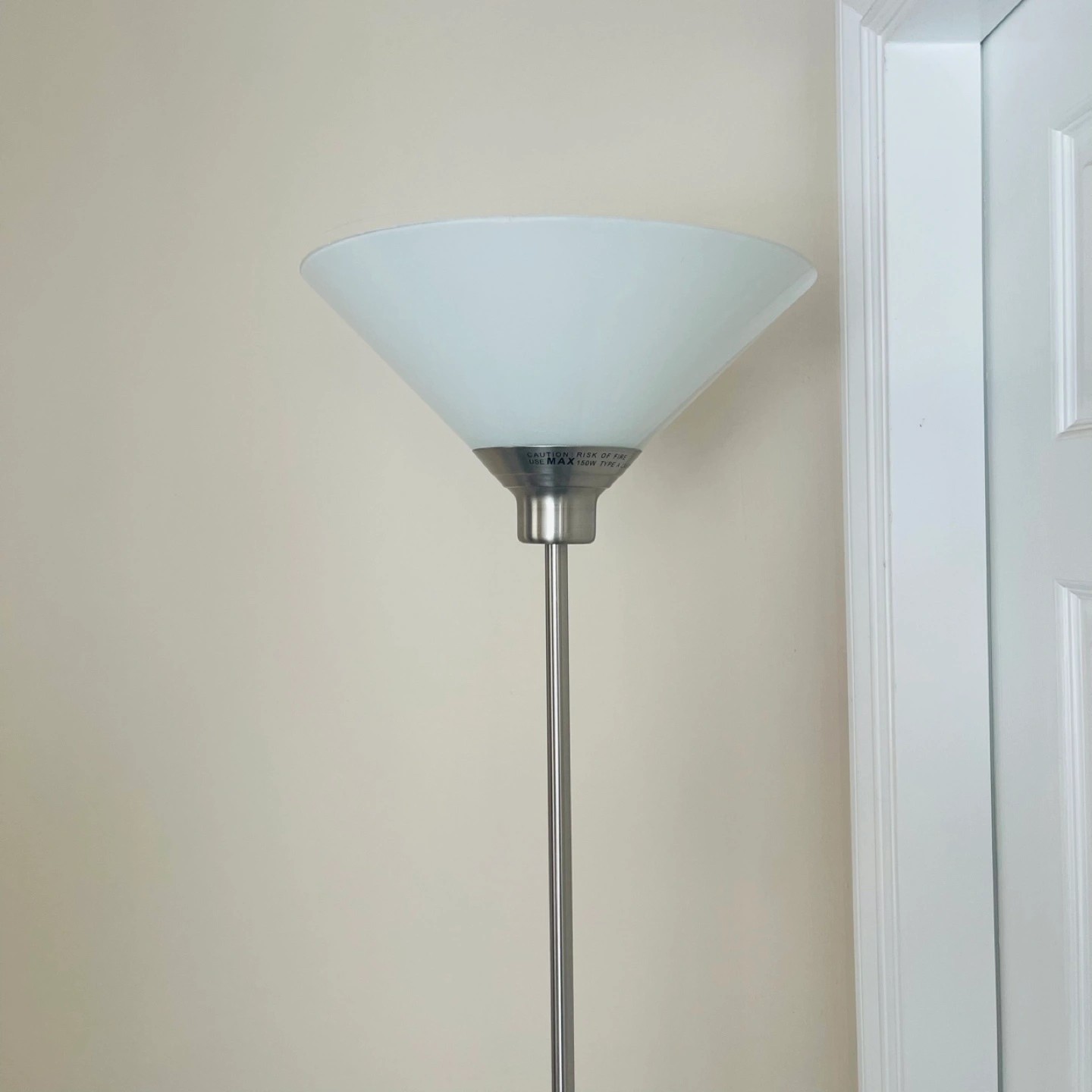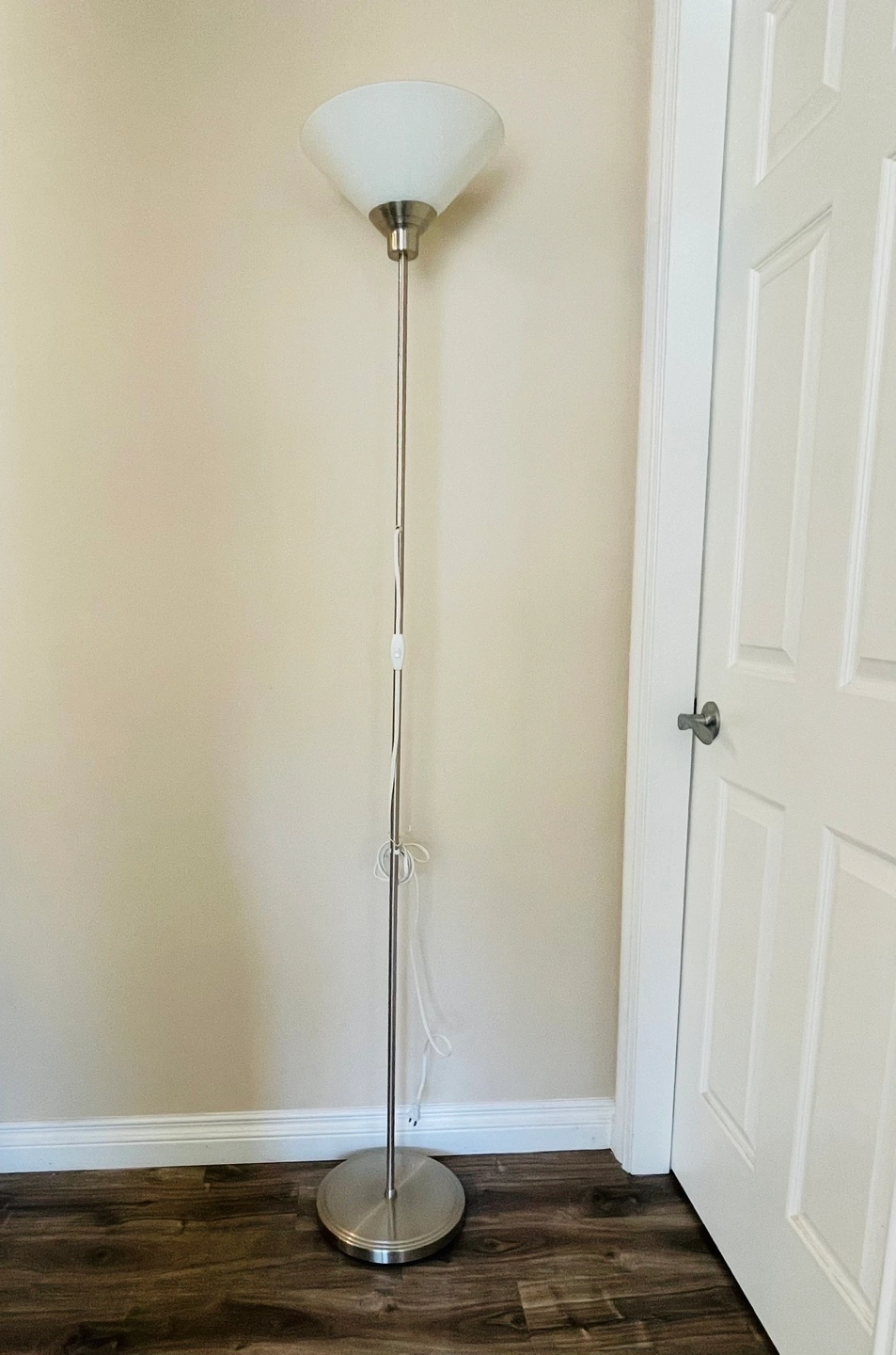 10Sleek floor lamp, brushed nickel finish. Simple design, white glass shade. Great for living room or bedroom. Good condition.